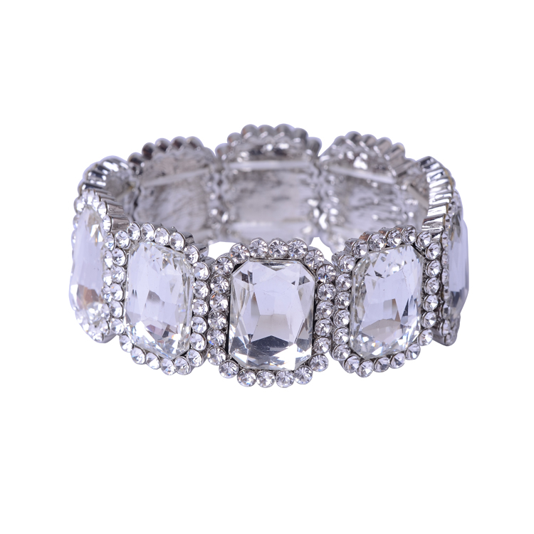 Rhodium Crystal Circles around a Radiant Crystal Shape Stretch Bracelet