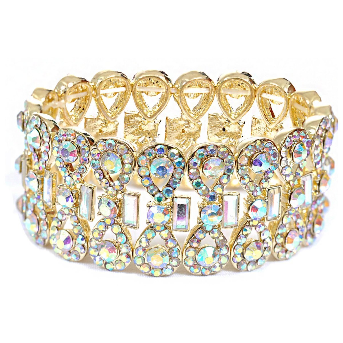 Gold Aurora Borealis Rhinestone Infinity Shape with Rectangle Crystal Stretch Bracelet