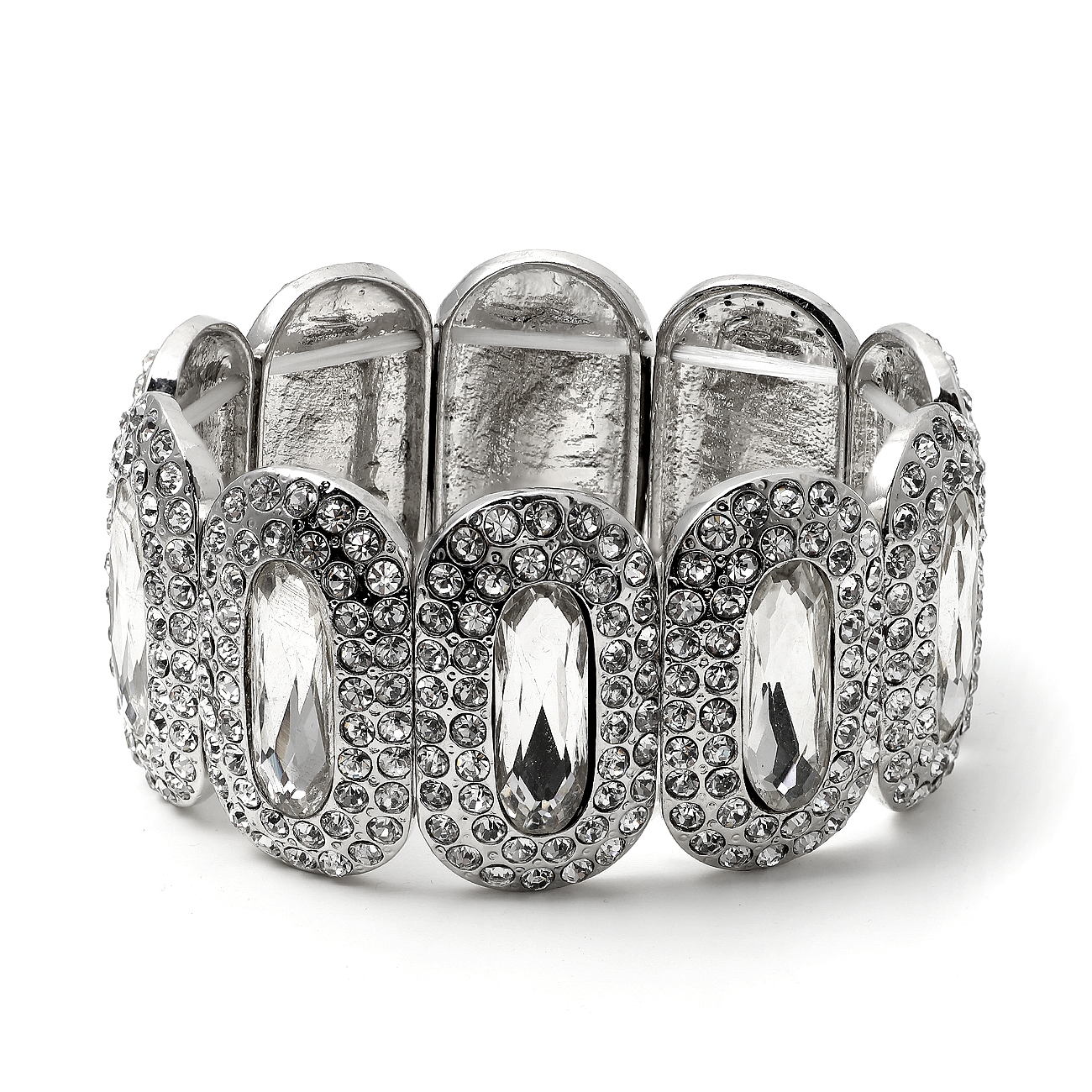 Silver Crystal Rhinestones around Crystal Oval Shapes Stretch Bracelet