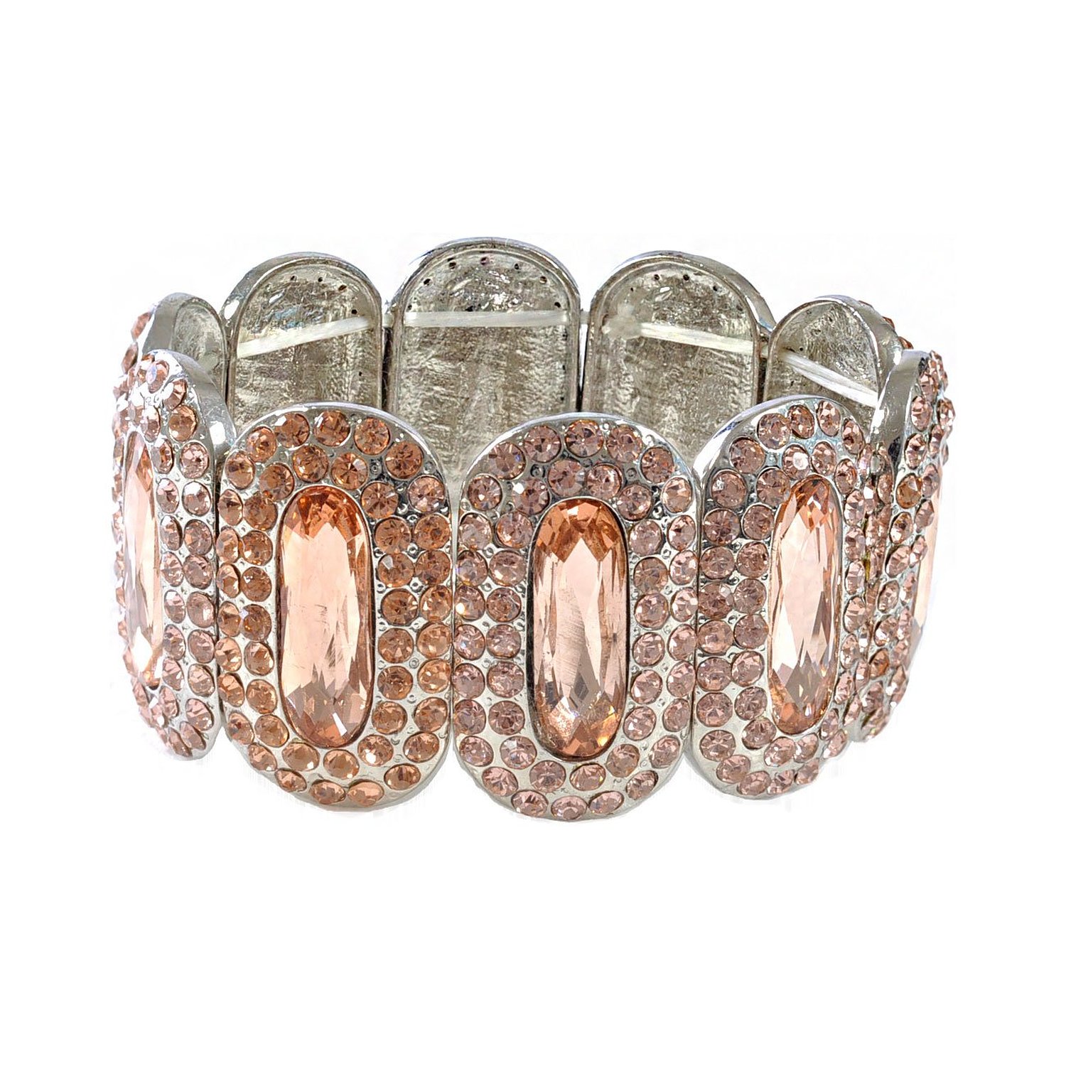 Silver Light Peach Rhinestones around Light Peach Oval Shapes Stretch Bracelet