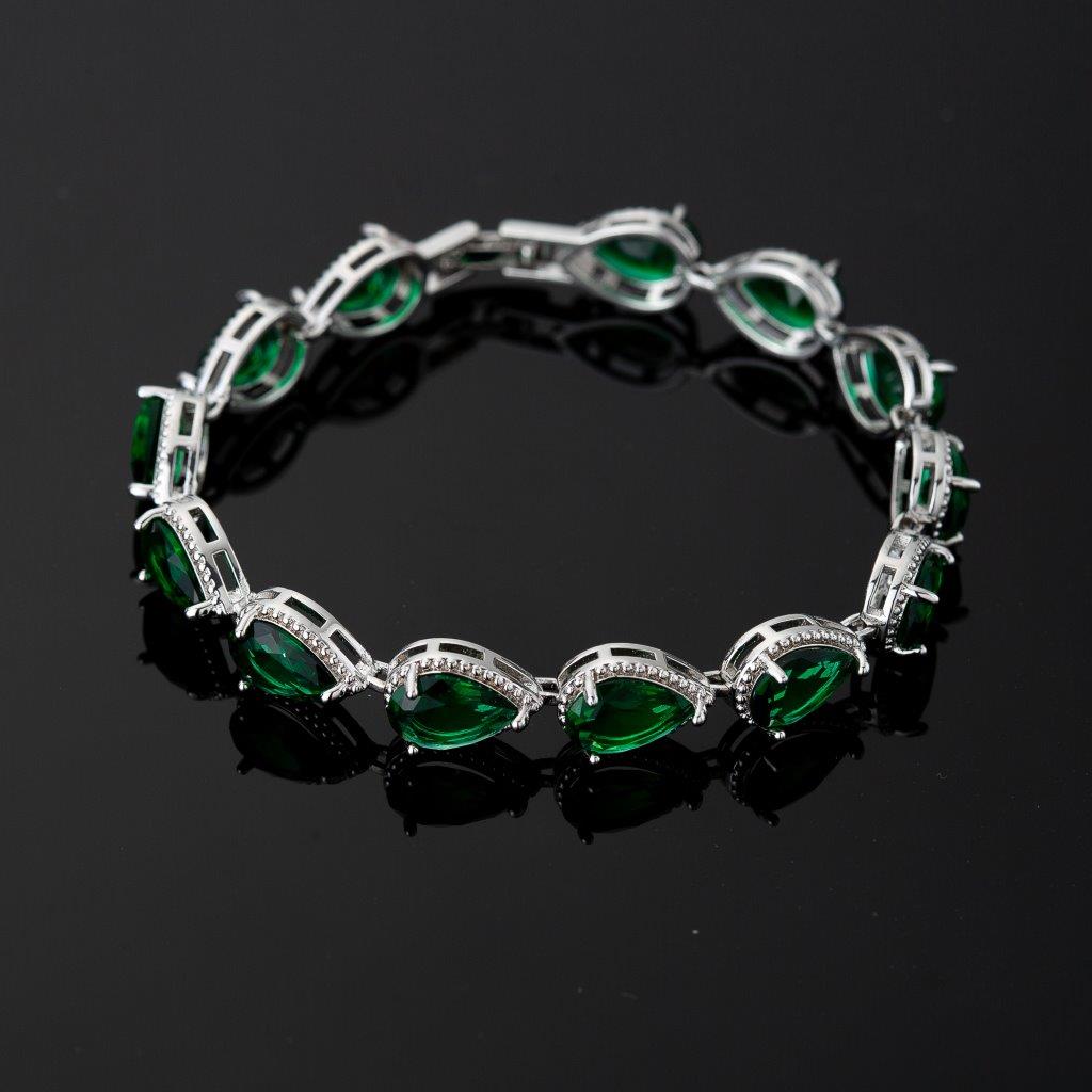 Featuring a delicate teardrop design, this bracelet showcases the radiant beauty of green cubic zirconia stones. The rich emerald hue sparkles and shines, reminiscent of the lush green landscapes that symbolize vitality and growth.