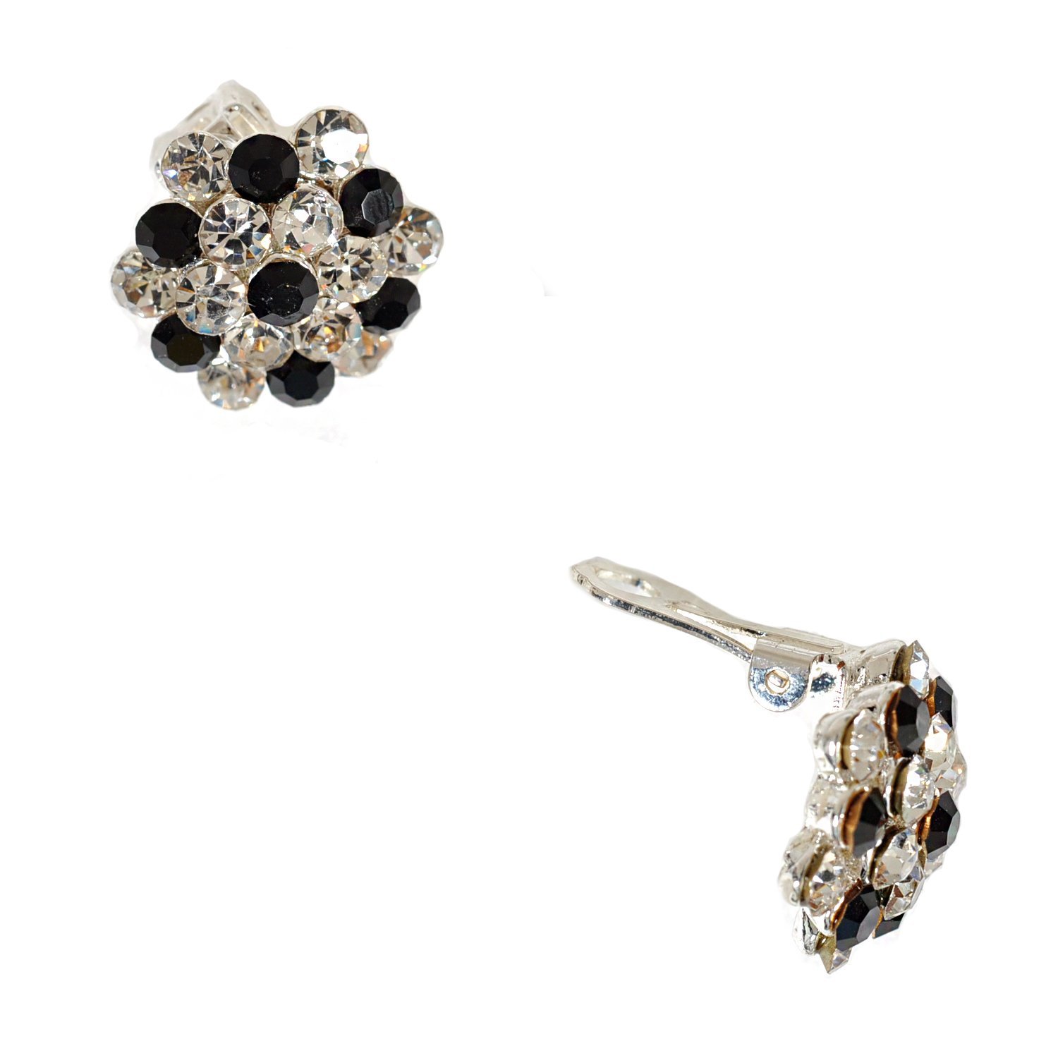 Silver Jet Rhinestone 15mm Circle Round Flower Shape Clip Earrings