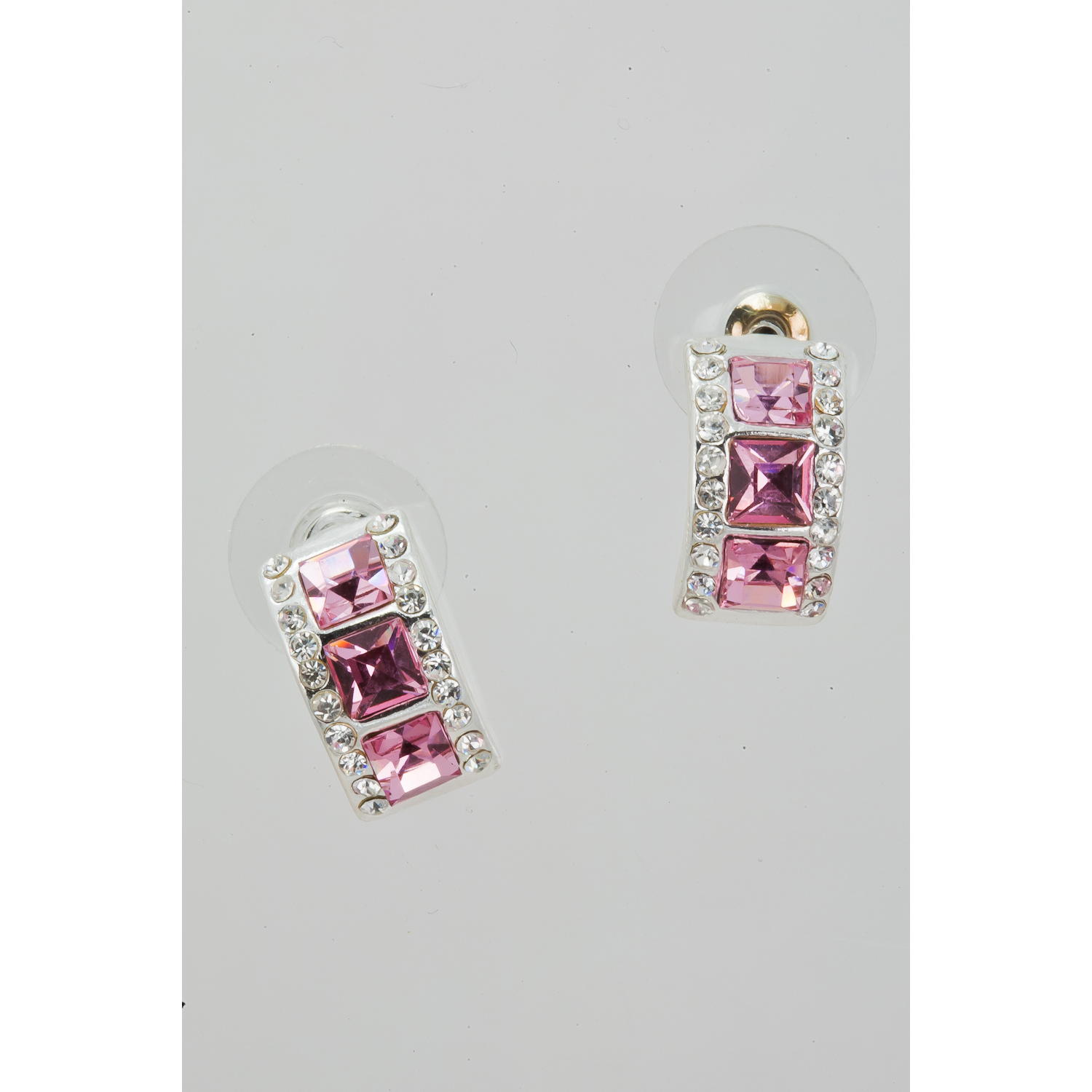 Silver Light Rose Rhinestone 15mm Semi Hoop Square Diamond Shape Stud Earrings