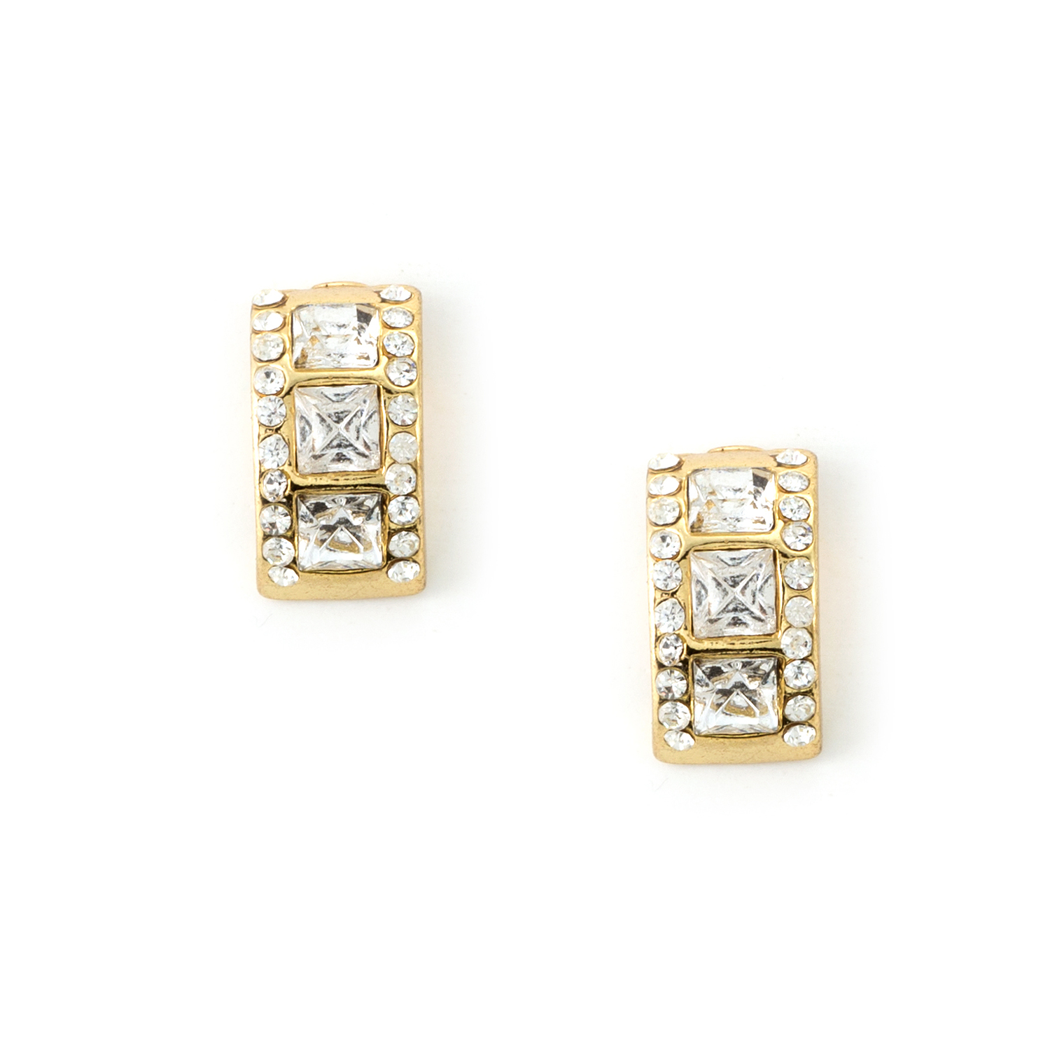 Gold Crystal Rhinestone Semi Hoop Rectangle Stud Earrings