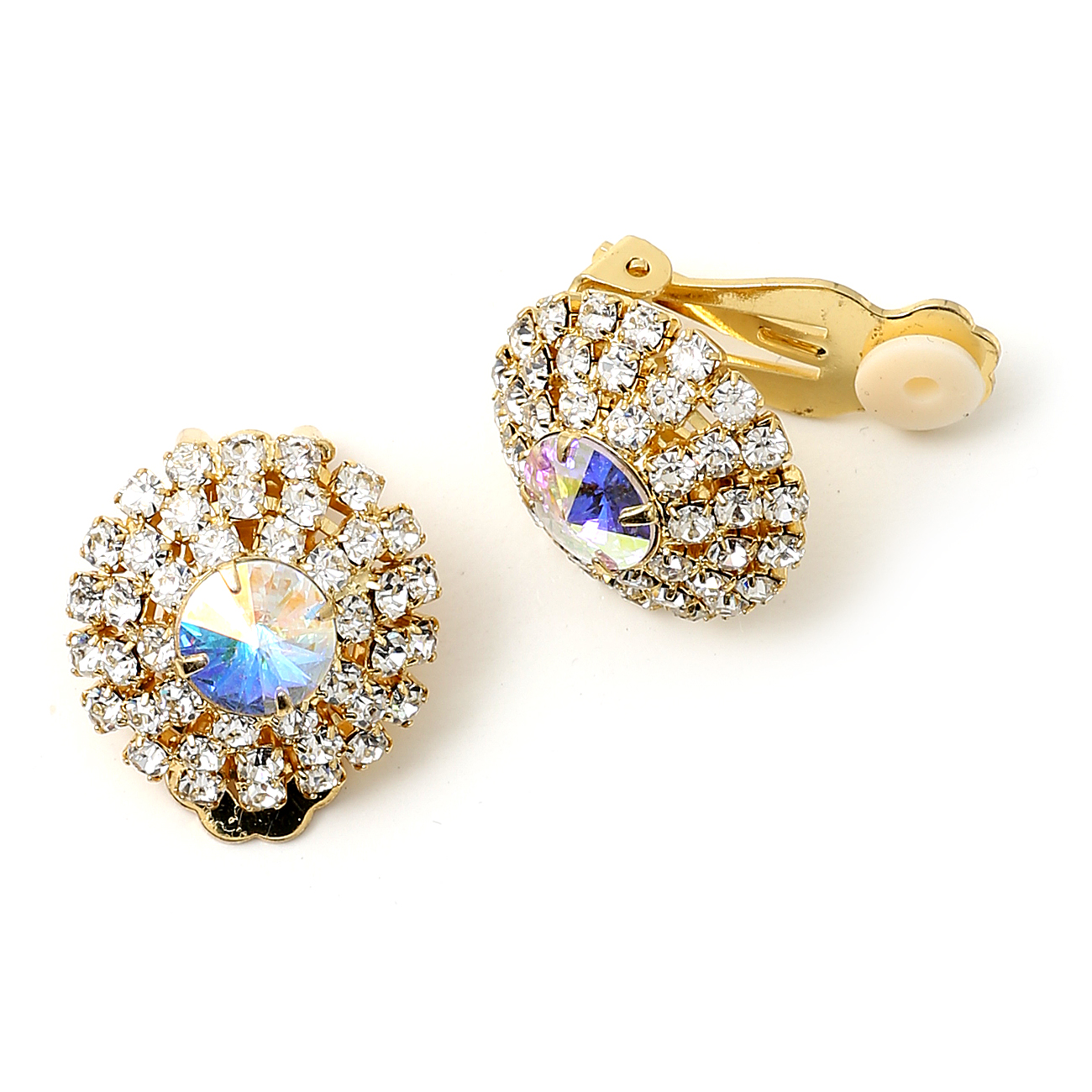 Gold Aurora Borealis Rhinestone Round Parasol shaped Clip Earrings