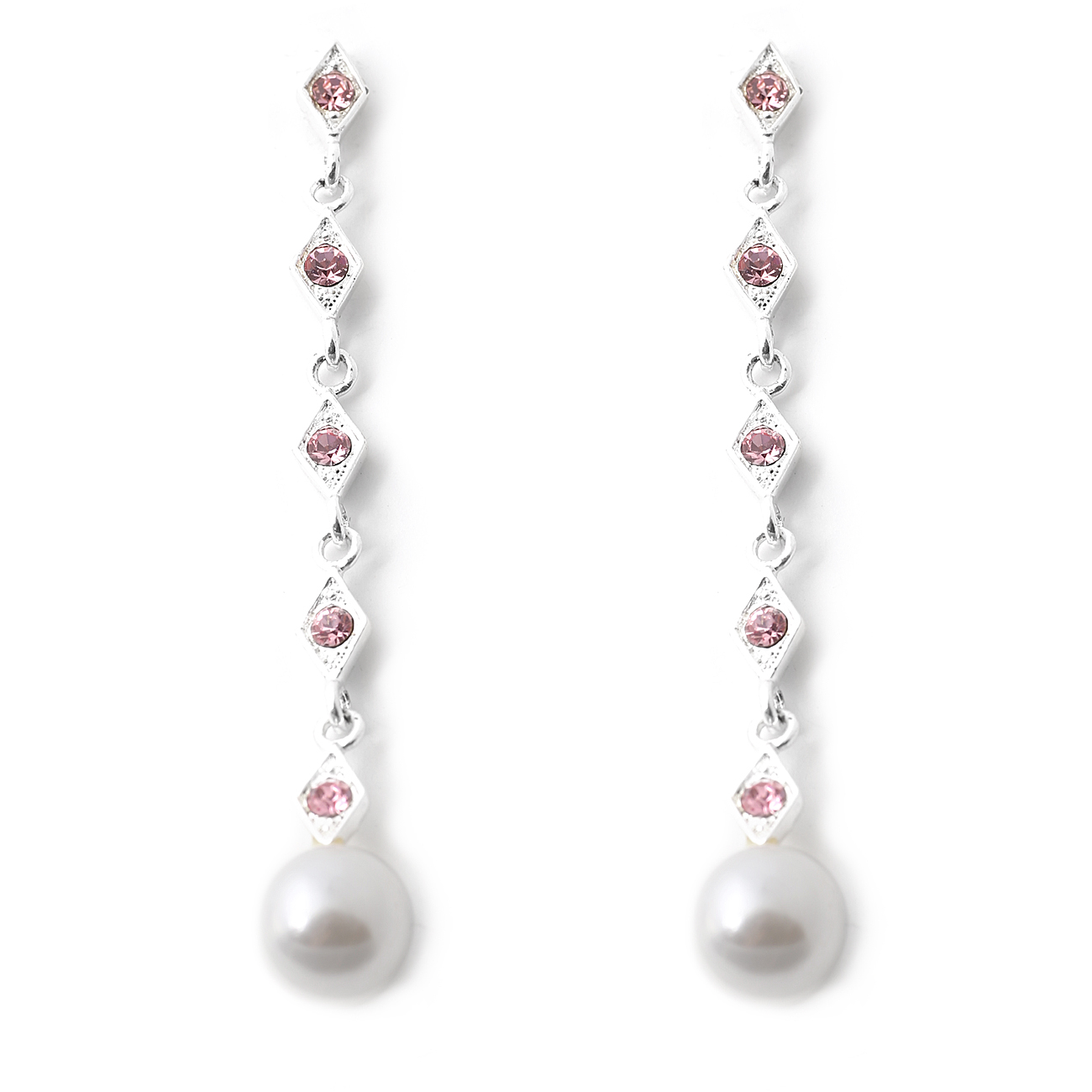Silver Dangle Diamond Shape with Light Amethyst Stone Insert and White Pearl Earrings