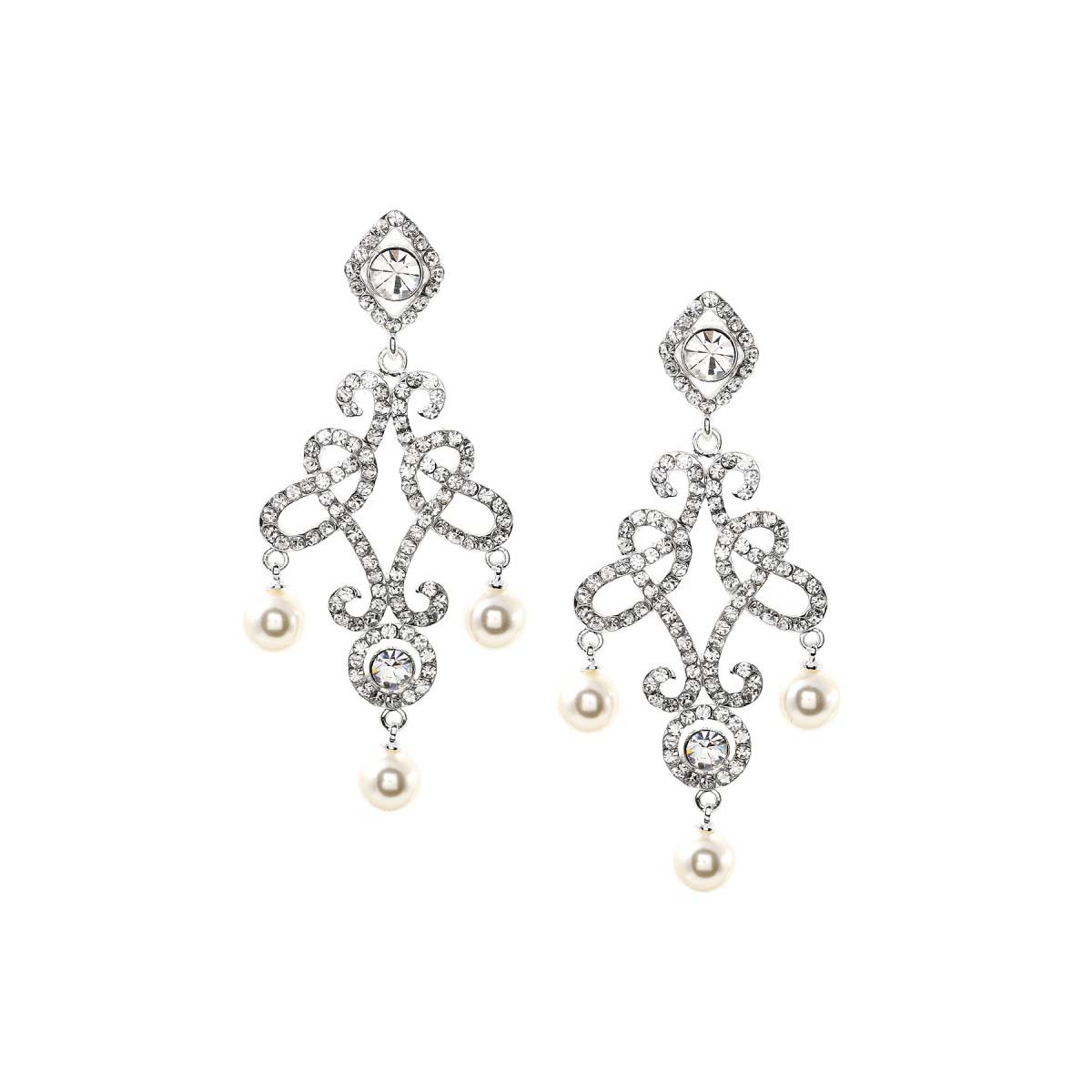 Silver Crystal Rhinestone & White Pearl Drop Chandelier Dangle Earrings