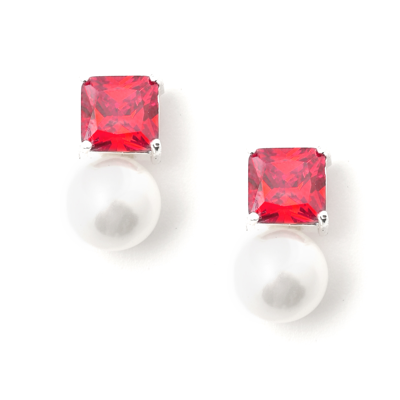 Silver Light Siam Square Stone White Pearl Stud Earrings