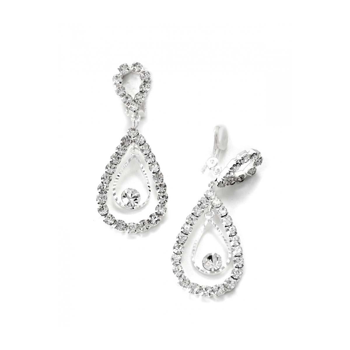 Silver Crystal Rhinestone Two Layer Teardrop Pear Dangle Clip Earrings