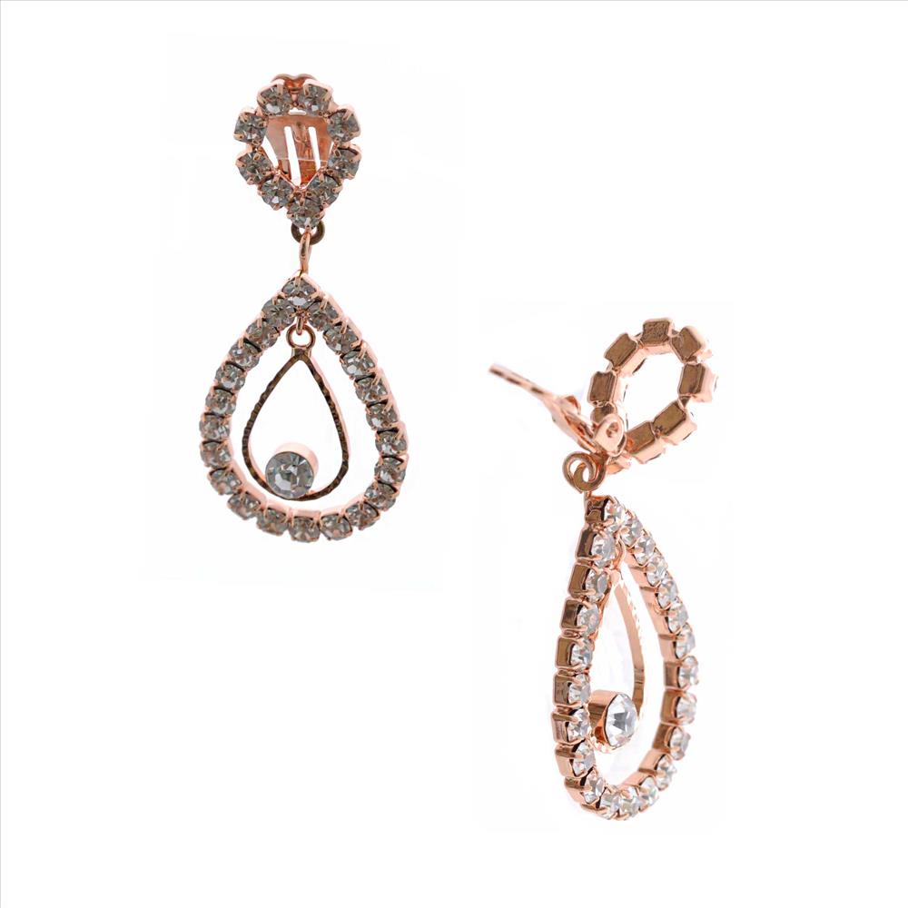Rose Gold Crystal Rhinestone Two Layer Teardrop Pear Dangle Clip Earrings