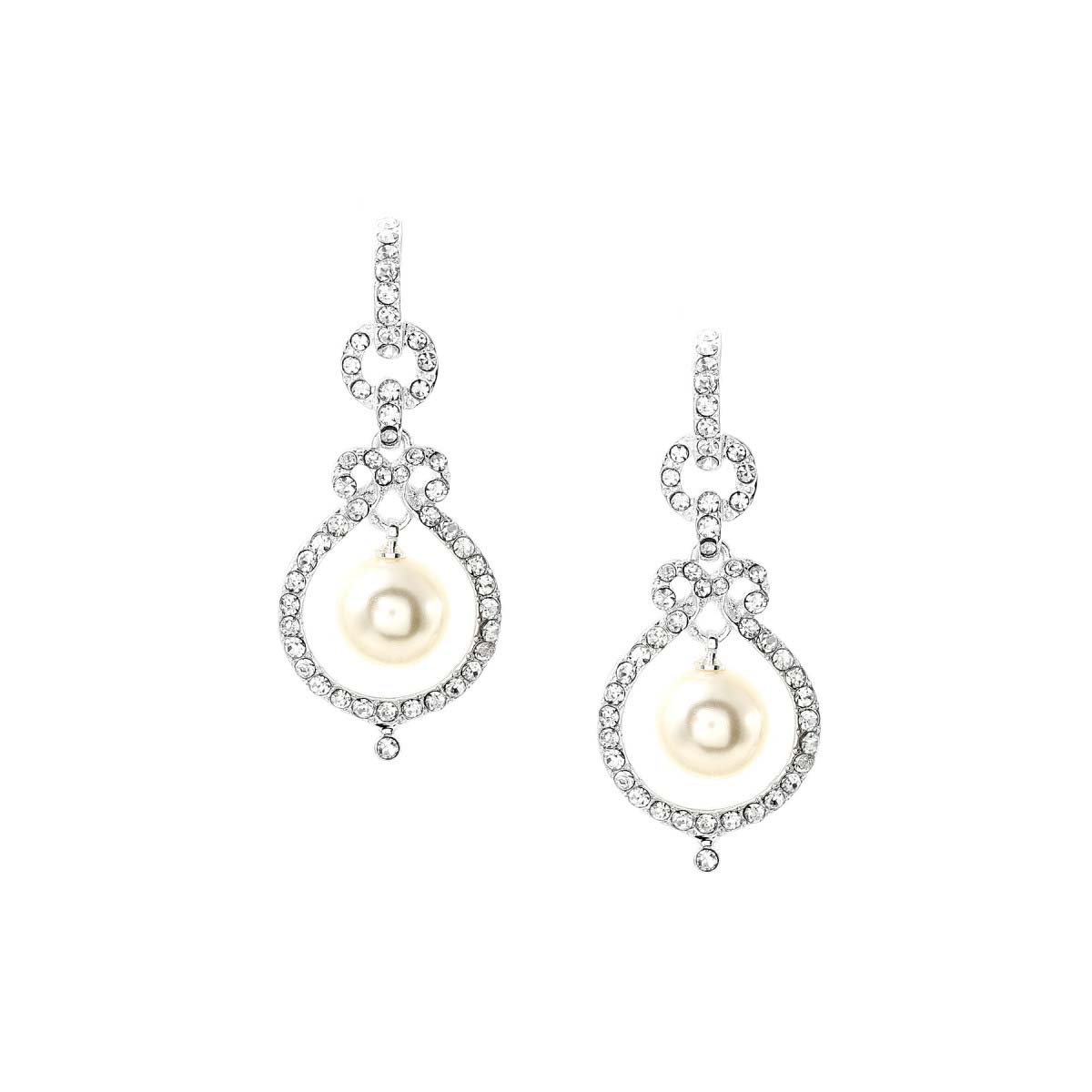 Silver Crystal Rhinestone Rondelle Round Shaped Dangle Earrings with White Pearl Drop