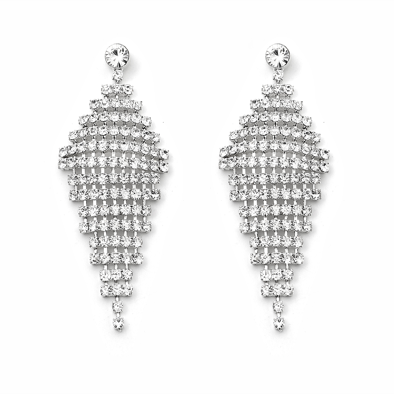 Silver Clear Filled Elongated Diamond Shape Rhinestone Dangle Earrings