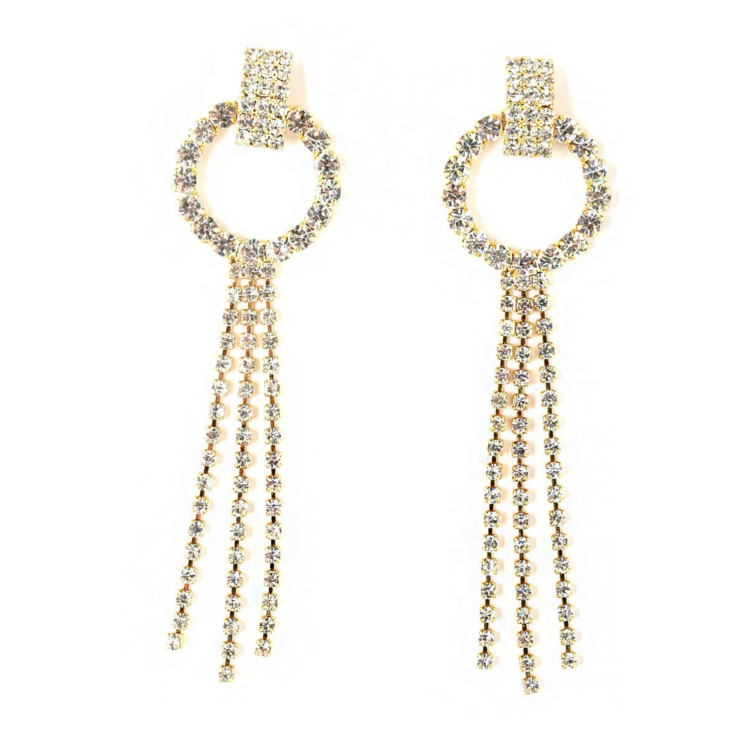 Gold Plated Crystal Rhinestone 3 Row Silver Crystal Dangle Earrings
