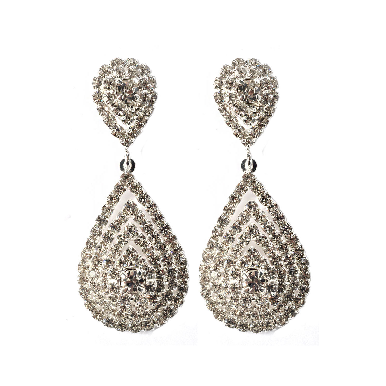 Silver Crystal Rhinestone Pave Pear Teardrop Shape Dangle Earrings