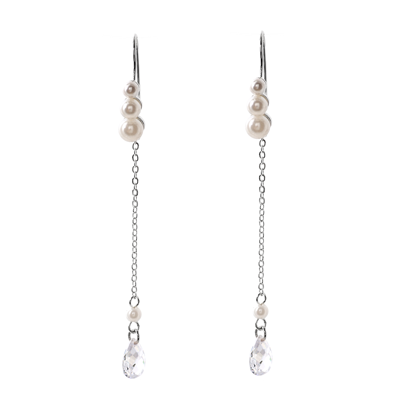 Silver Plated Chain with 3 White Pearl Top and Teardrop Shape Crystal Cubic Zirconia Tip Hook Dangle Earrings