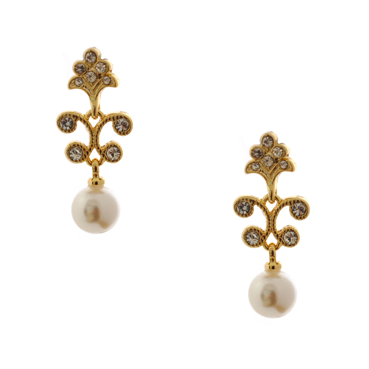 Gold Crystal Rhinestone Dangle Earrings with White Pearl Drop