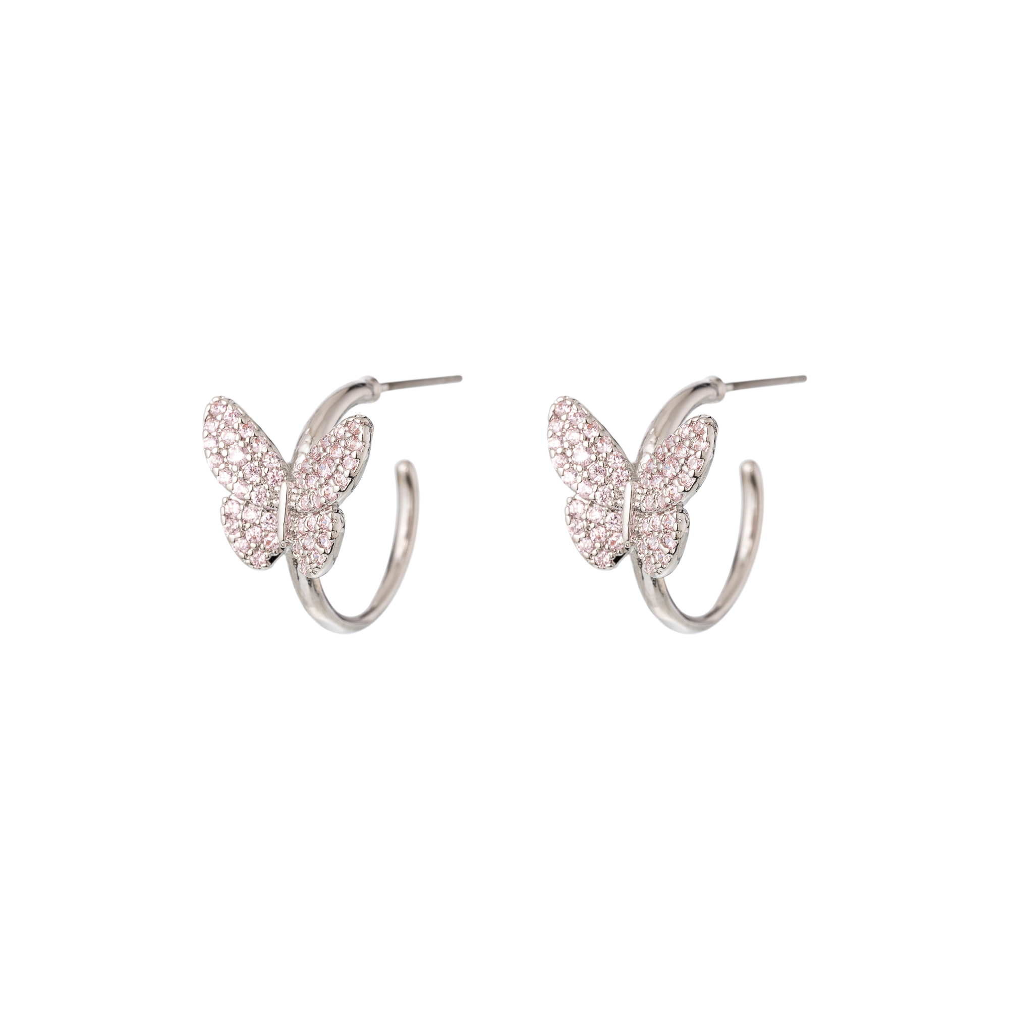 Introducing the Silver Light Pink Crystal Butterfly Hoop Earrings, the perfect accessory to flutter your way into the fashion scene. These earrings combine the elegance of crystal with the playful charm of butterflies, creating a unique and dazzling look.