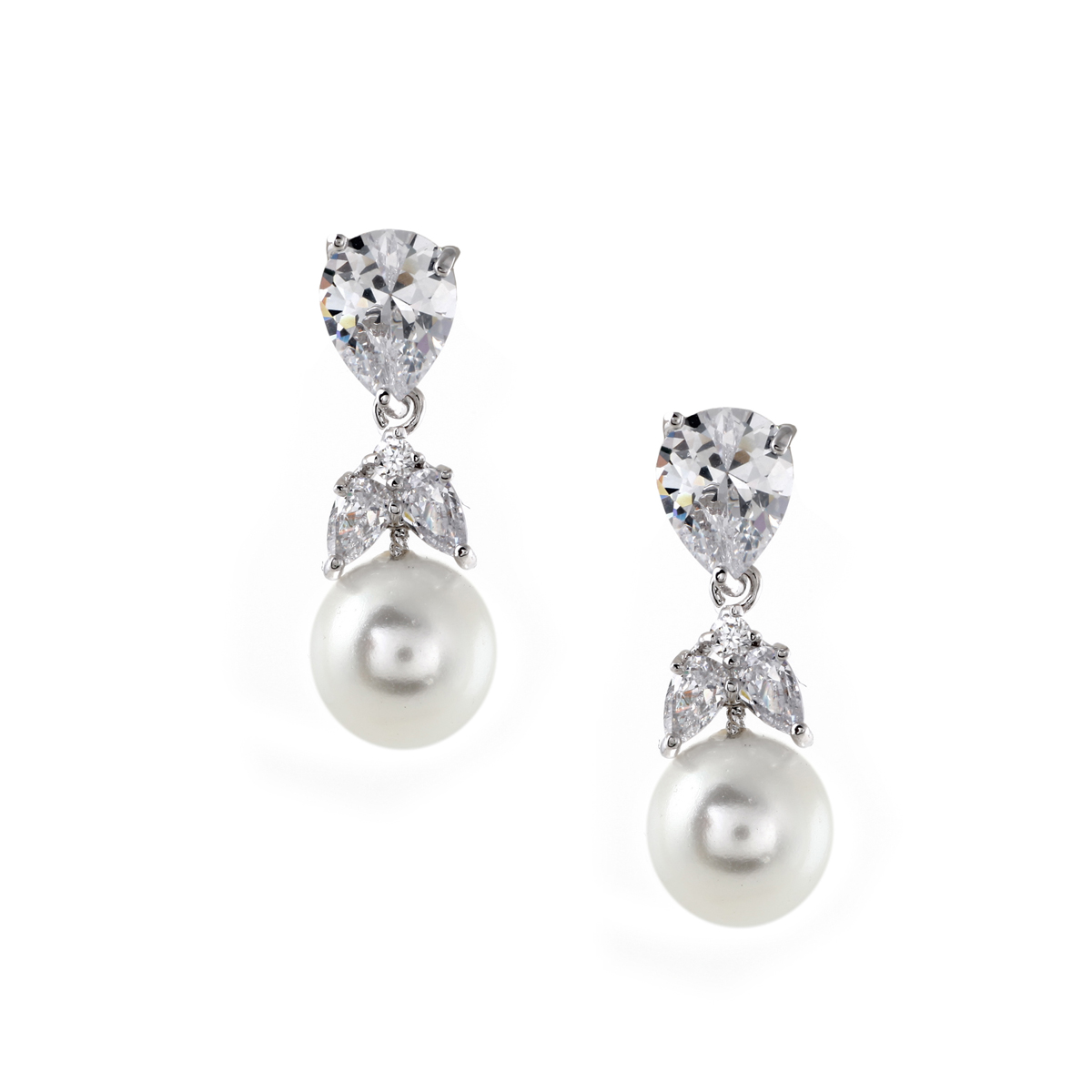 Rhodium Crystal Cubic Zirconia Dangle Earrings with White Pearl