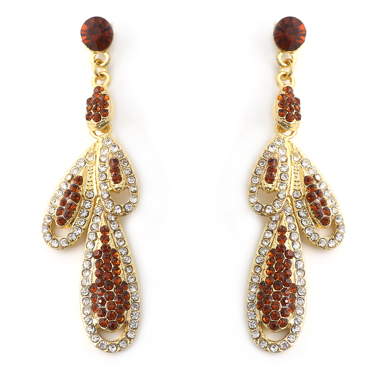Gold Plated Red Rhinestones Filled 3 Crystal Teardrop Shape Rhinestone Dangle Earrings
