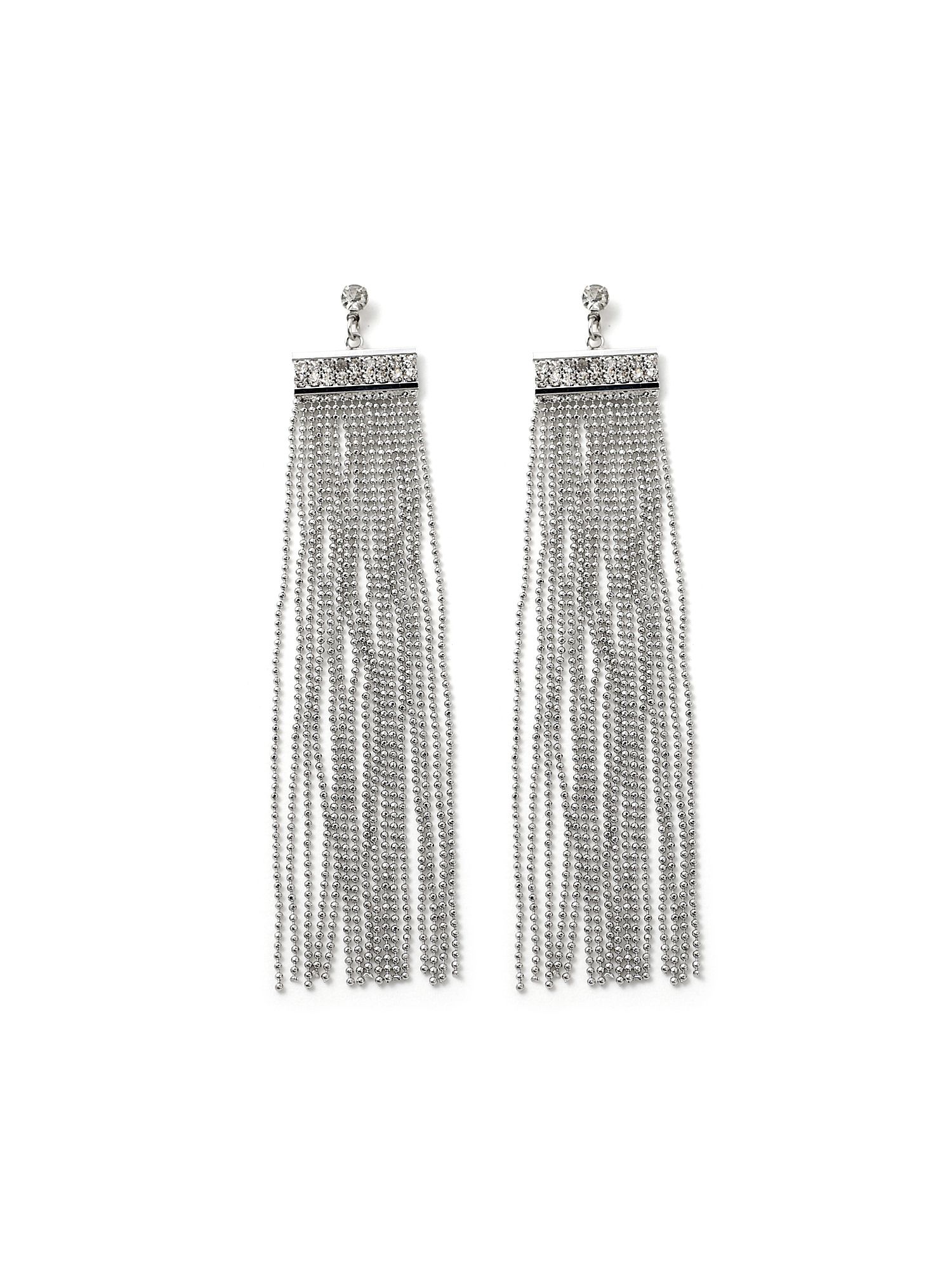 Rhodium Crystal Rhinestone with Dangle Silver Multi String Bead Curtain Earrings