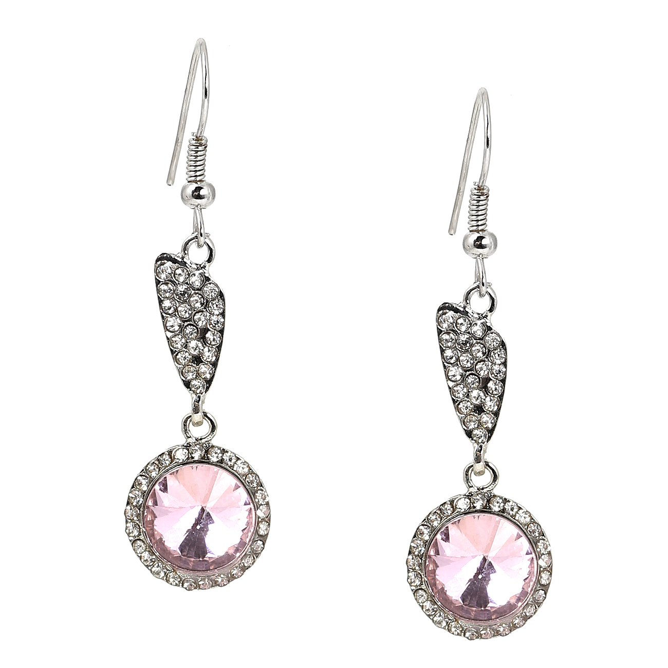 Rhodium Crystal Rhinestone in Oblong Shape with Dangle Crystal Rhinestones Around Light Rose Stone Earrings