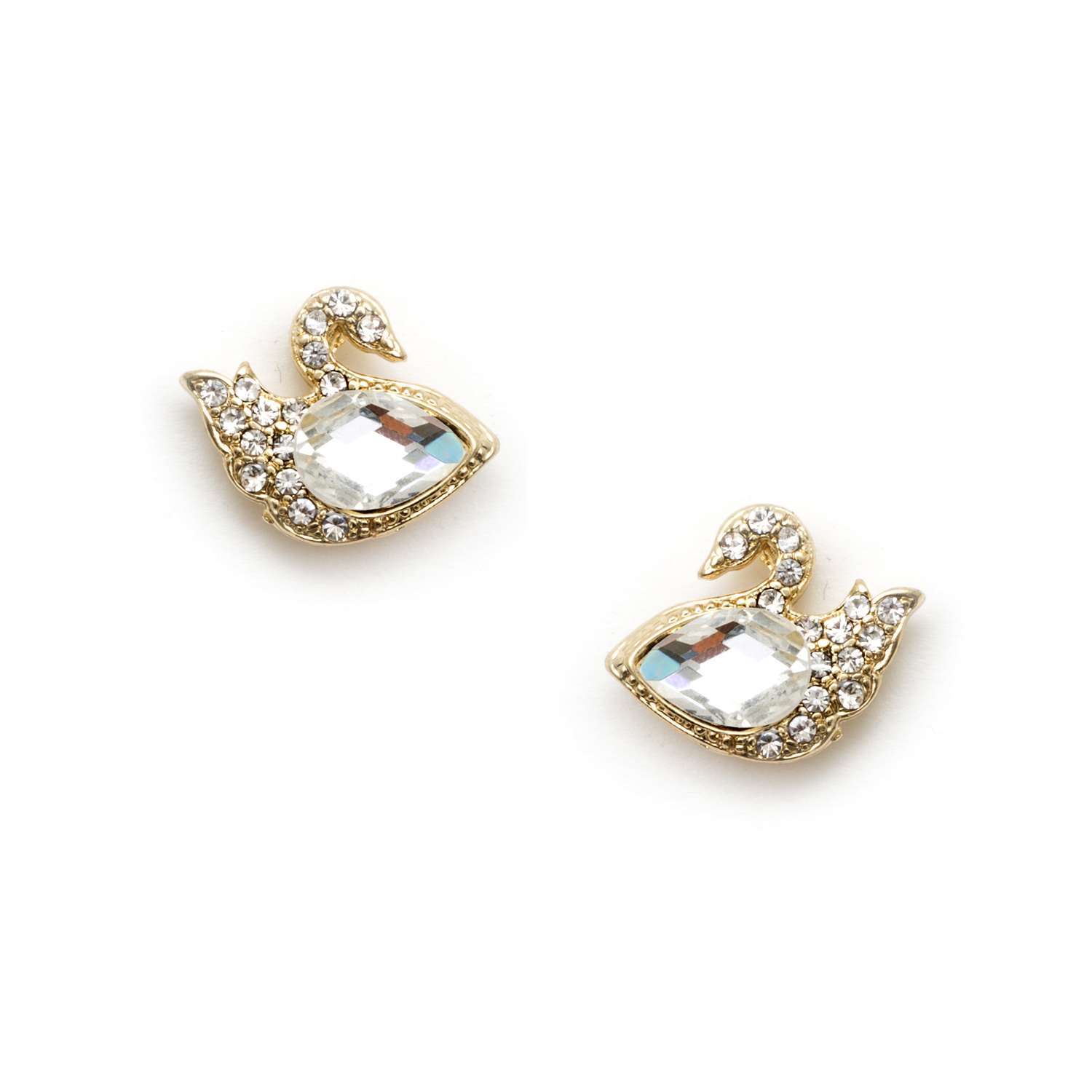 Gold Crystal Rhinestone Swan Shaped Stud Earrings with Pear Shaped Stone on Gold Plate