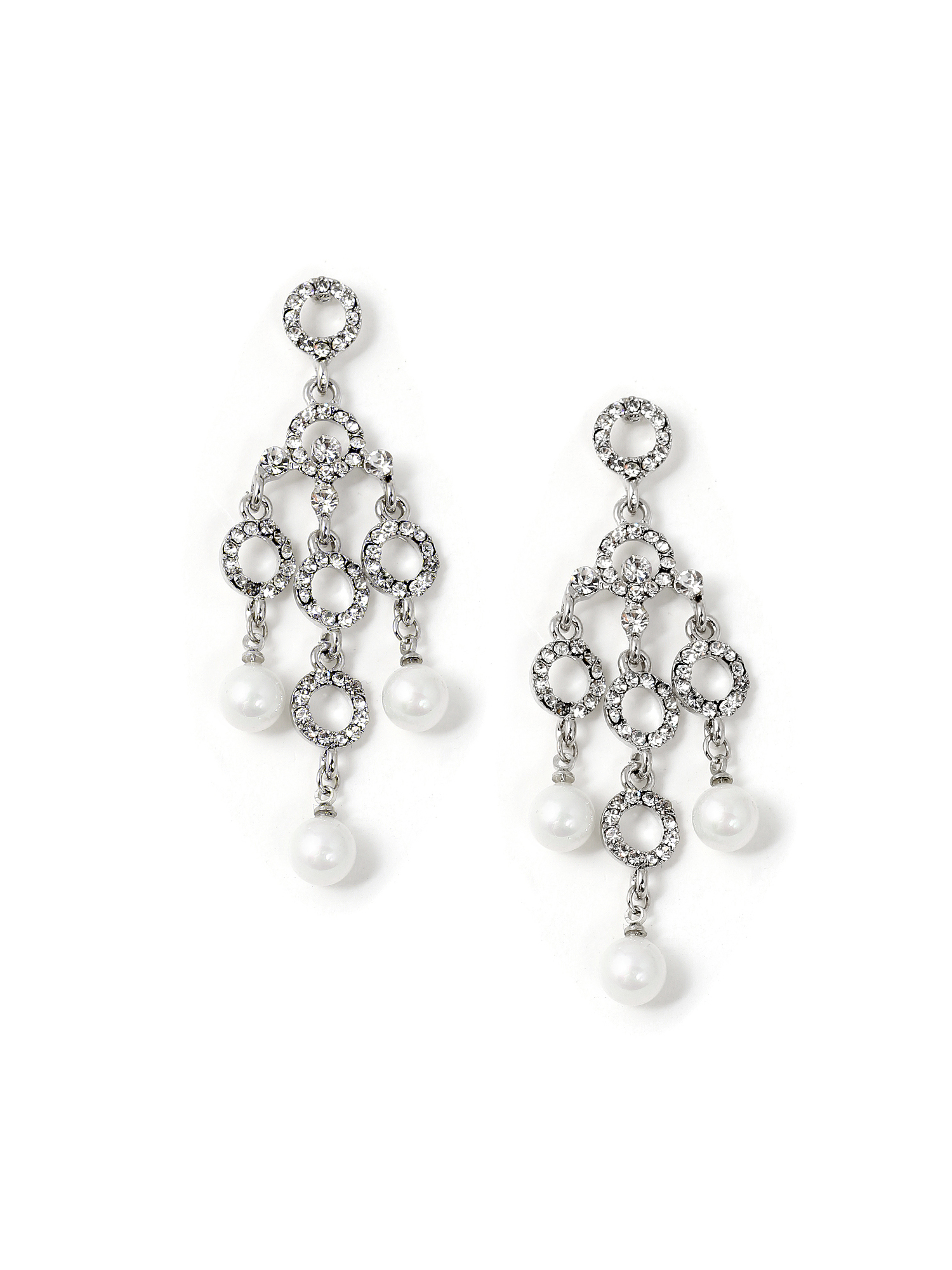 Rhodium Crystal Rhinestone in Circle Shapes with Dangle White Pearl Earrings