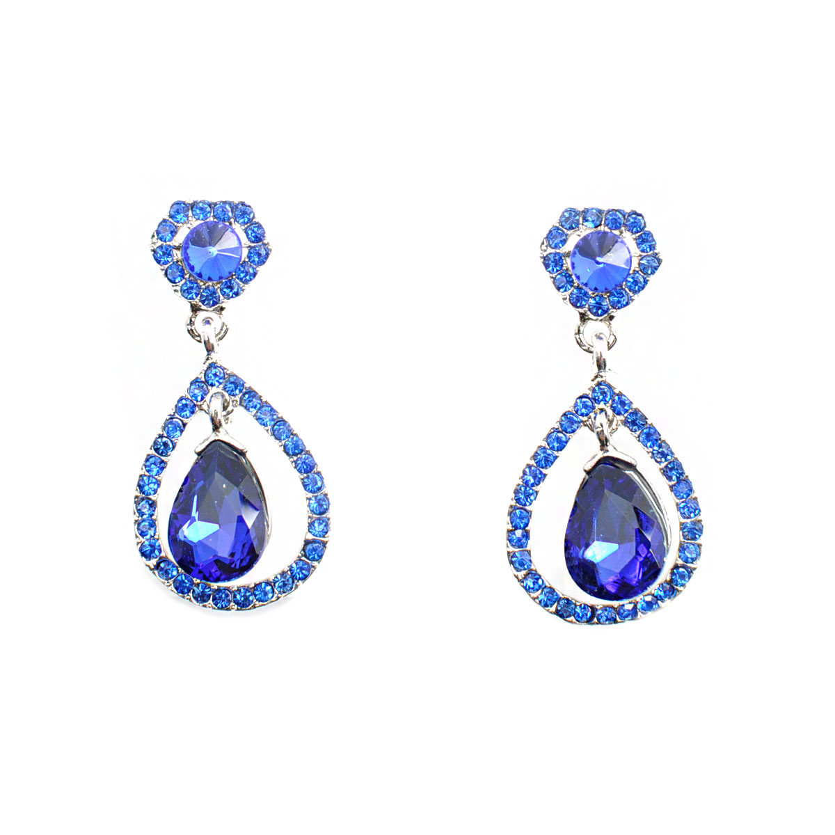 Silver Sapphire Round Circle & Teardrop Pear Shape Rhinestone Linked Dangle Earlings
