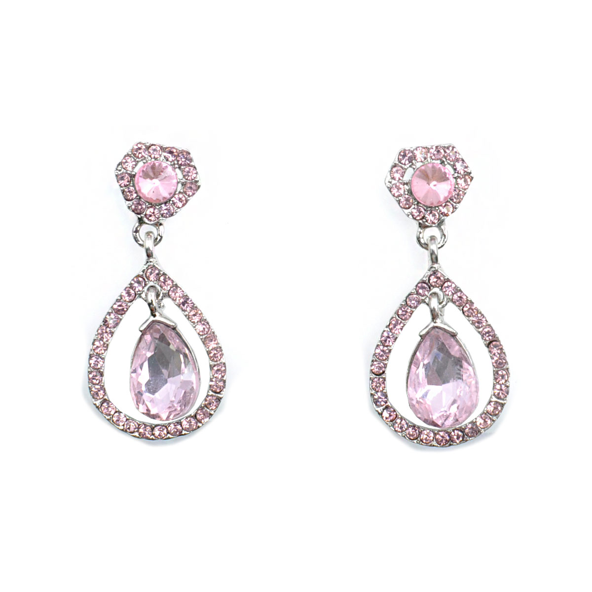 Silver Light Rose Round Circle & Teardrop Pear Shape Rhinestone Linked Dangle Earrings