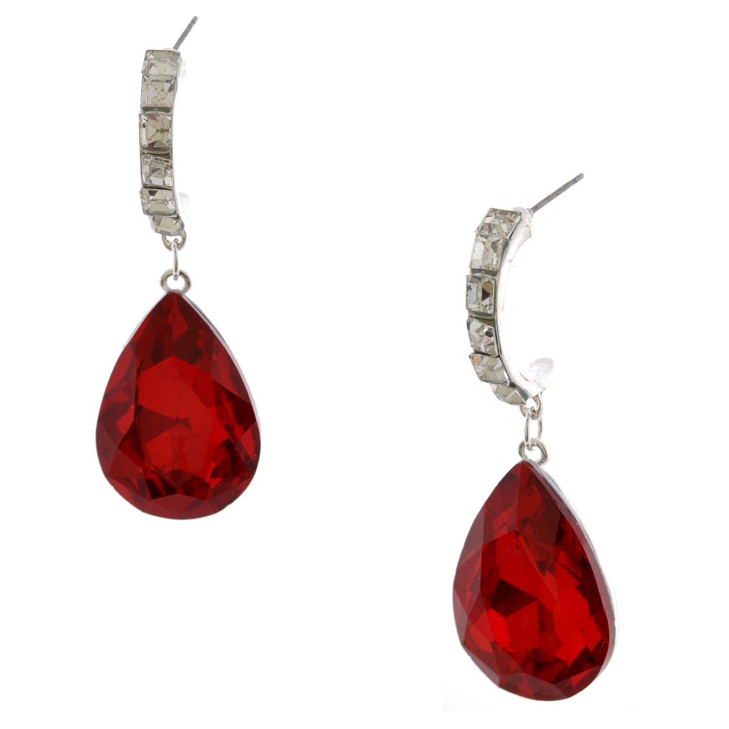 Silver Crystal Square Stone in Semi Hoop with Dangle Large Teardrop Light Siam Stone Earrings