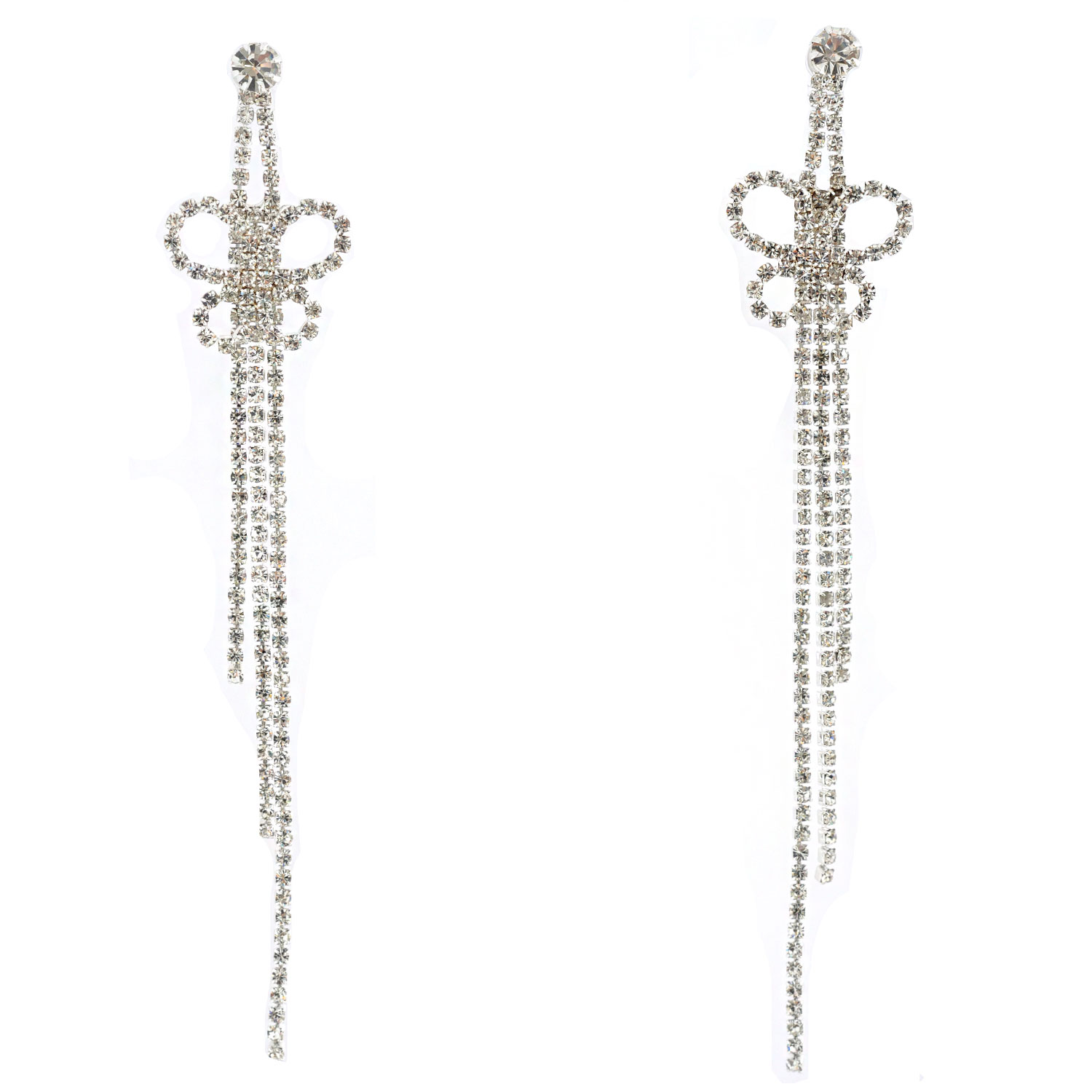 Bridal Jewelry Silver Plated Rhinestone Long String Butterfly Ribbon Dangle Earrings