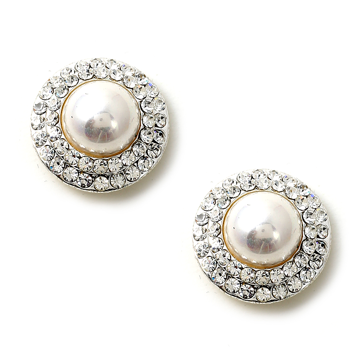 Silver Crystal Rhinestone Double Row Circle Around a White Pearl Center Earrings