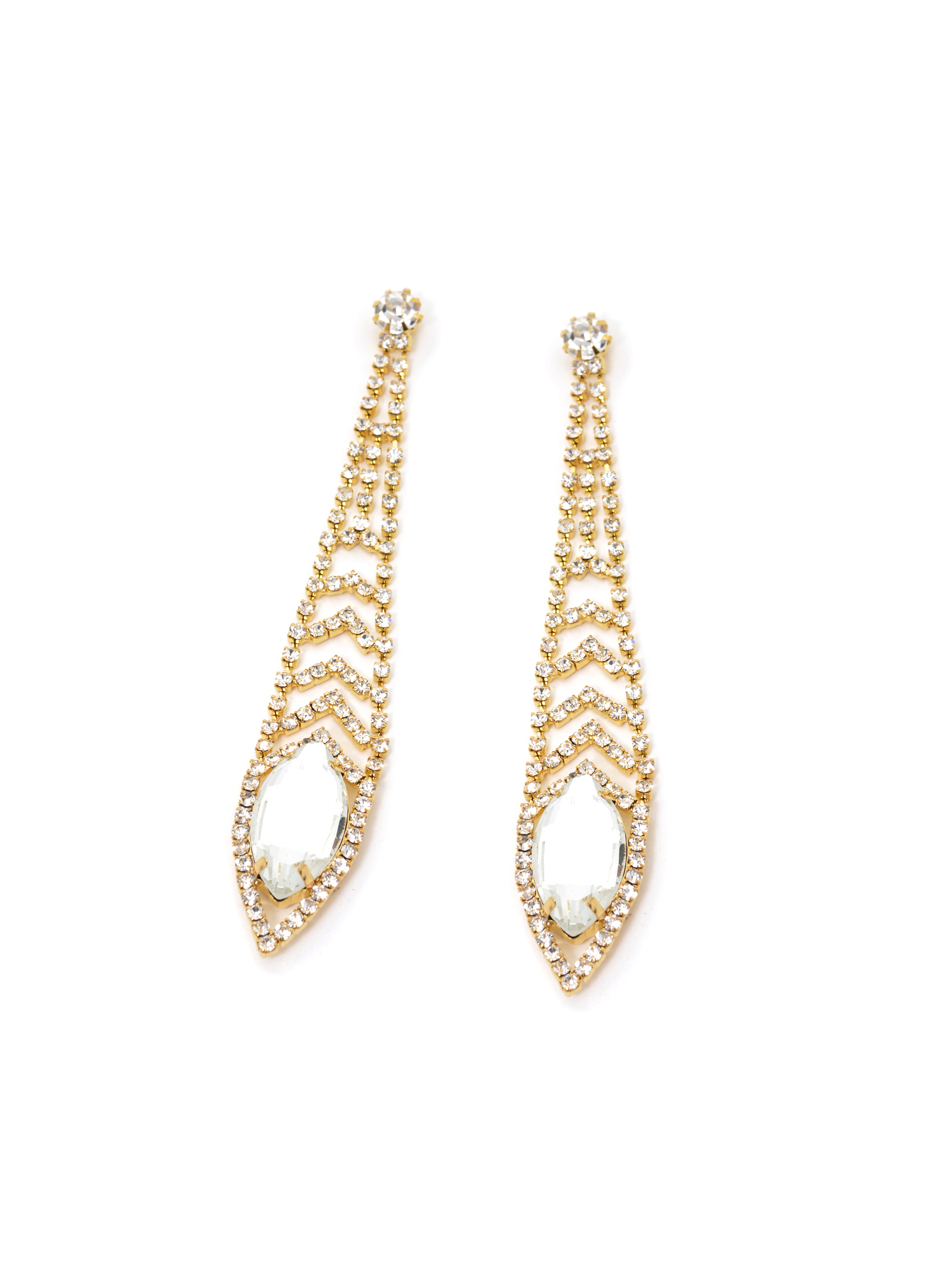 Gold Crystal Rhinestone with Large Cat Eye Stone Earrings