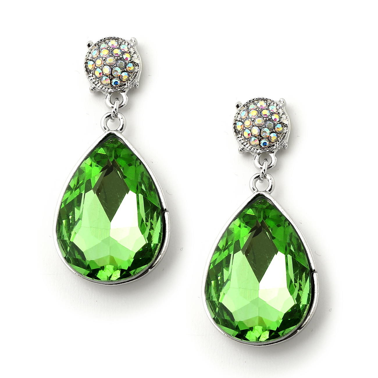 Rhodium Aurora Borealis Rhinestone Circle Shape with Large Peridot Teardrop Dangle Earrings