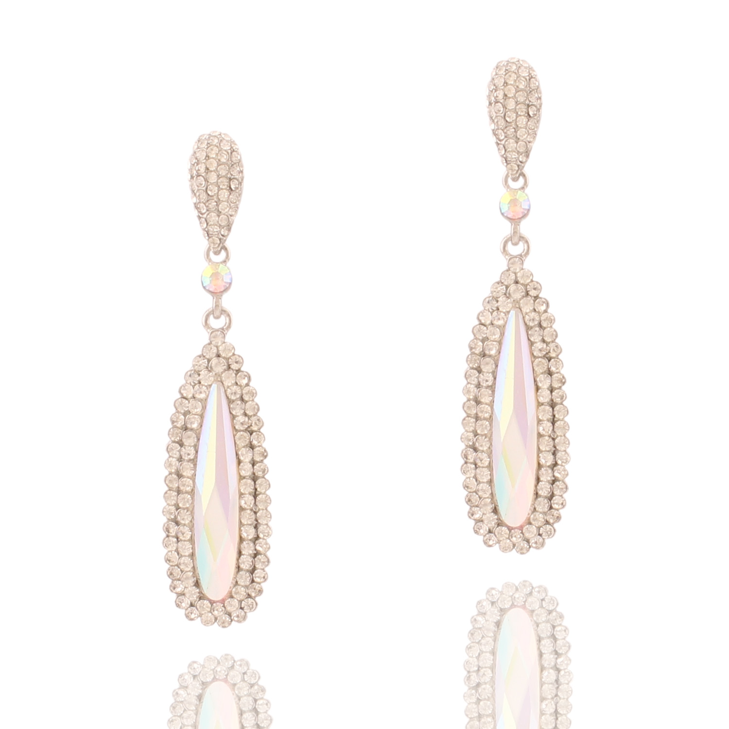 Rhodium Aurora Borealis Oblong Shape with Crystal Rhinestones Around Dangle Earrings