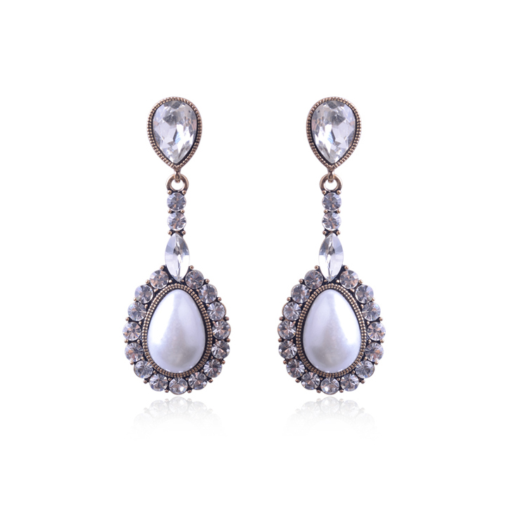 Rhodium Crystal with Dangle Egg Shape White Pearl Earrings