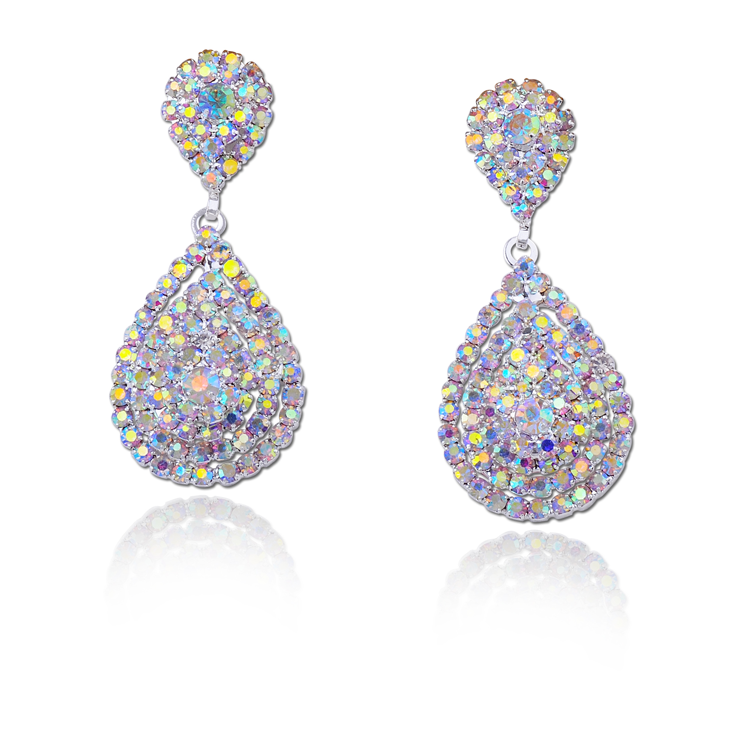 Wedding Earrings Silver Aurora Borealis Rhinestone Teardrop Formation Dangle Earrings