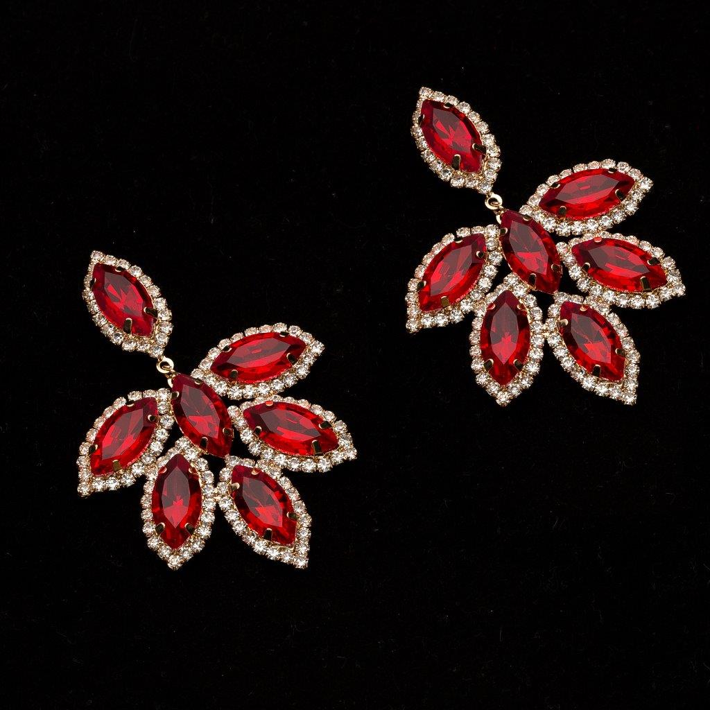 Crafted with meticulous attention to detail, these earrings feature a delicate chandelier design, adorned with dazzling rhinestones. The combination of the gold finish and the vibrant Light Siam stones creates a mesmerizing sparkle that is sure to turn heads wherever you go.