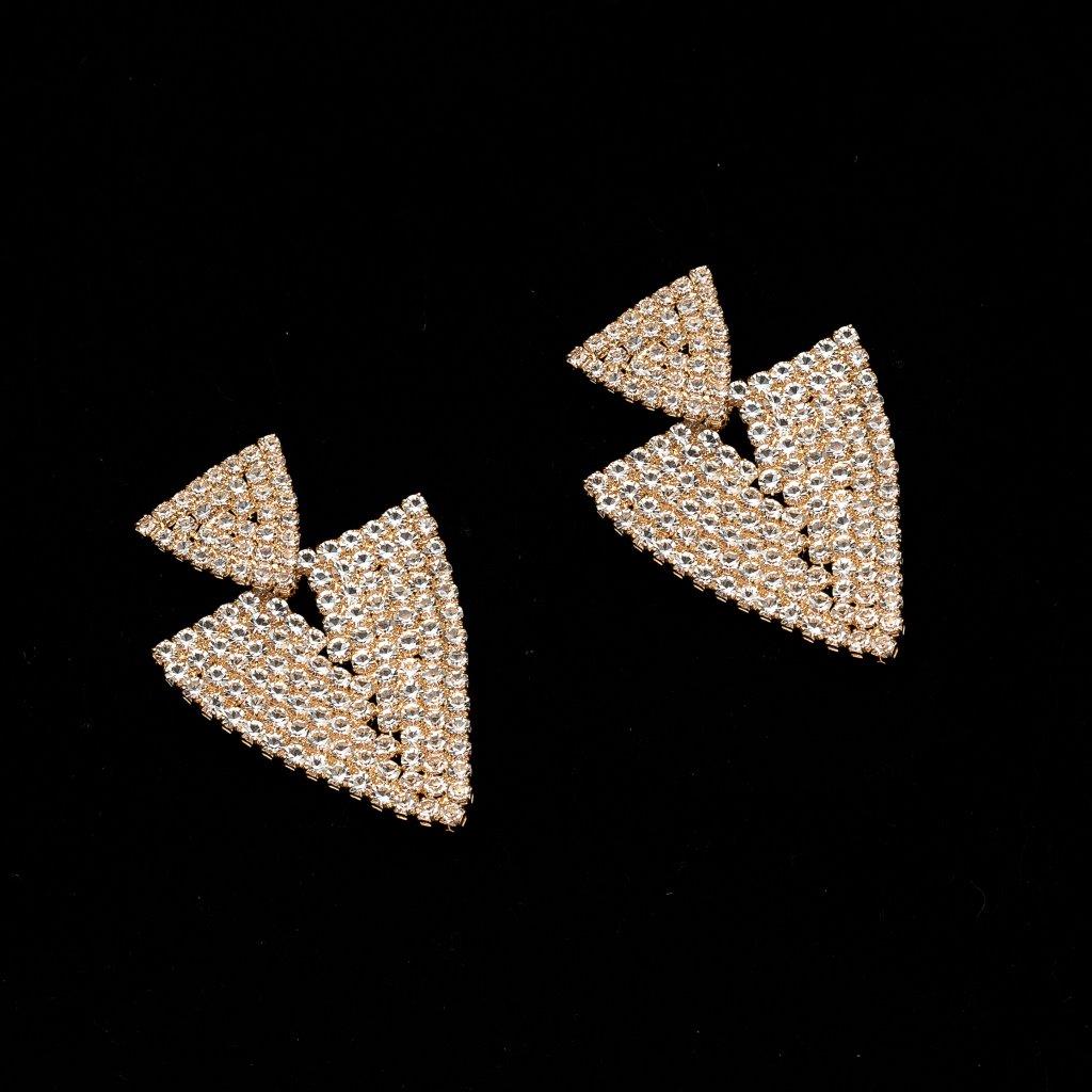 Inspired by timeless designs and constructed with meticulous attention to detail, these earrings showcase the perfect combination of crystal, gold, and rhinestone elements. Each earring features a stunning gold crystal triangle drop, delicately suspended from a dainty hook, creating a mesmerizing play of light and motion.