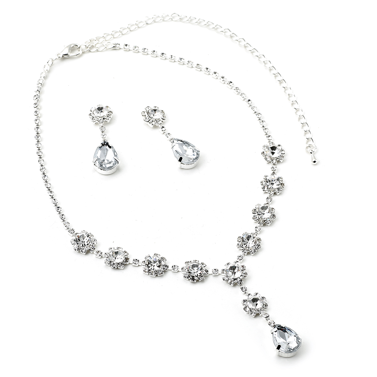 Silver Crystal Rhinestone Bridal Wedding Party Teardrop Shaped Dangle Earrings & Flower Shaped Tie Y Type Necklace Jewelry Set