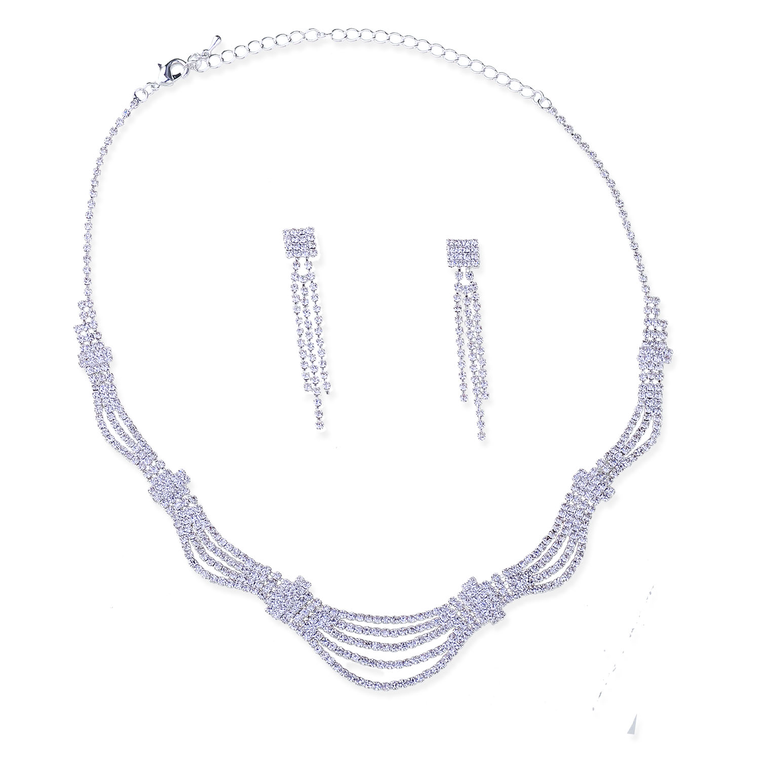Silver Crystal Rhinestone Bridal Wedding Party 3 Strands Dangle Earrings & 3-4 Row Tied Multi Strands Rhinestone Necklace Jewelry Set