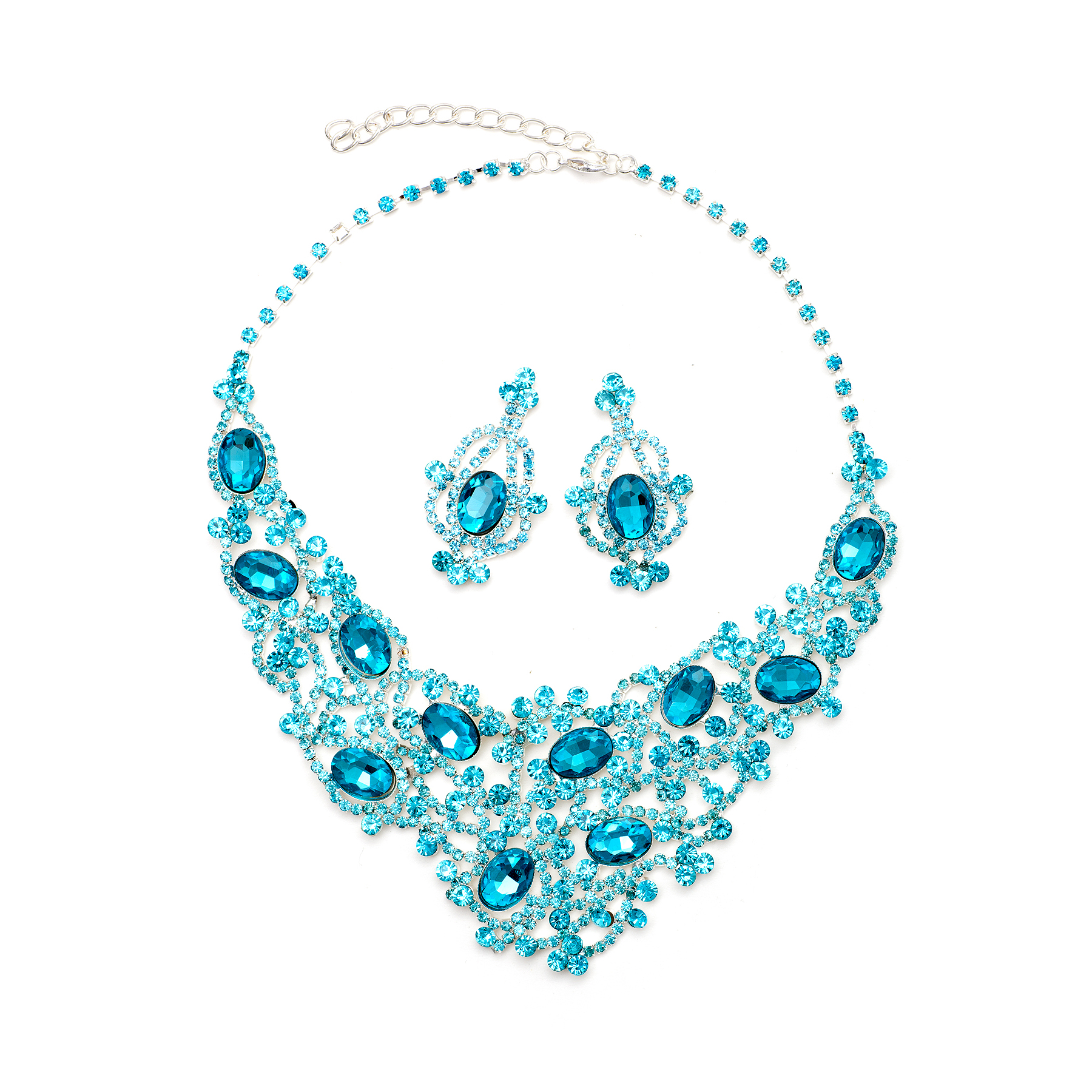 Silver Aqua Rhinestone Bridal Wedding Party Dangle Earrings & Tennis Net Style Necklace Jewelry Set
