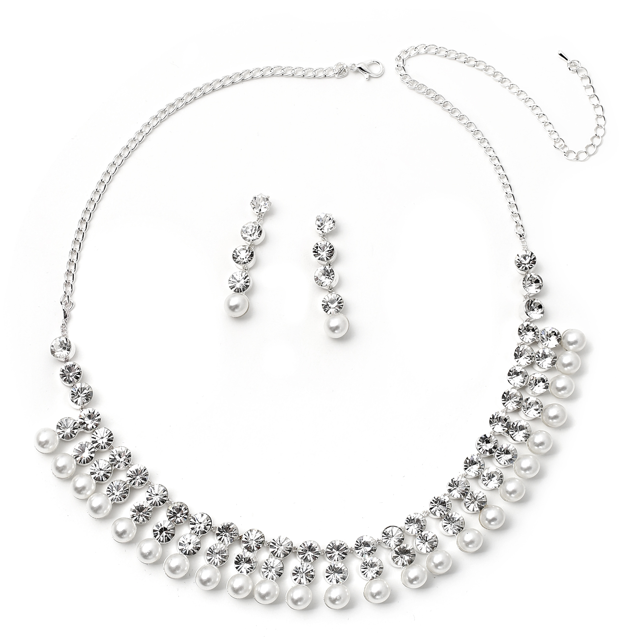 Silver Rhinestone 1 Row White Pearl Stack Necklace & Matching 4 Rhinestones 1 White Pearl Dangle Earrings Jewelry Set