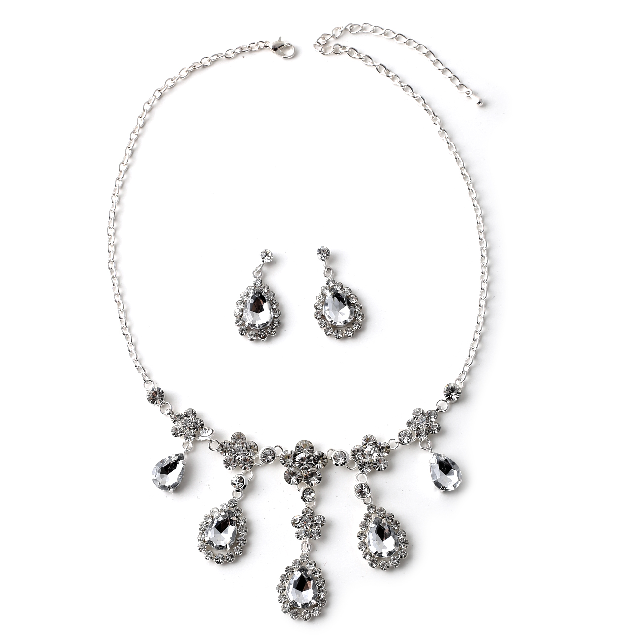 Silver Crystal Rhinestone Flower and Teardrops with Rhinestones Around Necklace and Matching Earrings Jewelry Set