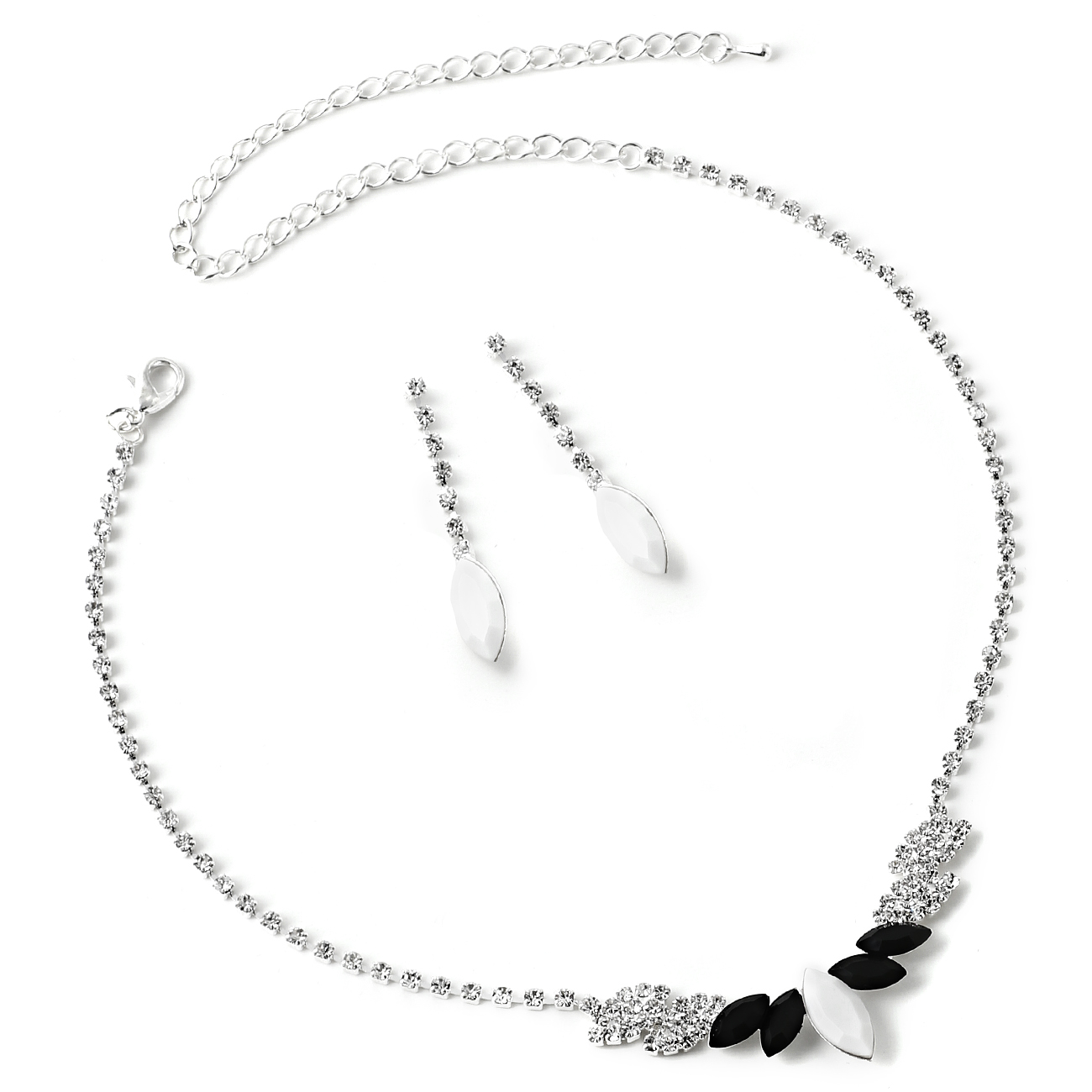 Silver Crystal Rhinestone with Jet and White Eye Shaped Stones Necklace with Matching Earrings Jewelry Set