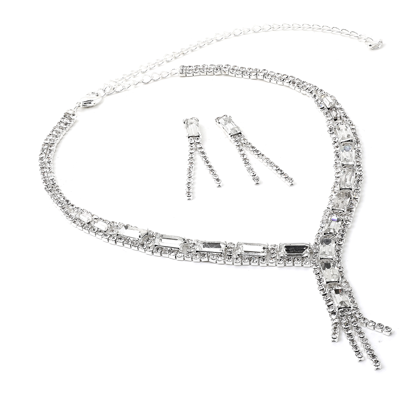 Silver Crystal Rhinestone with Rectangle Stones Necklace and Matching Dangle Earrings Jewelry Set