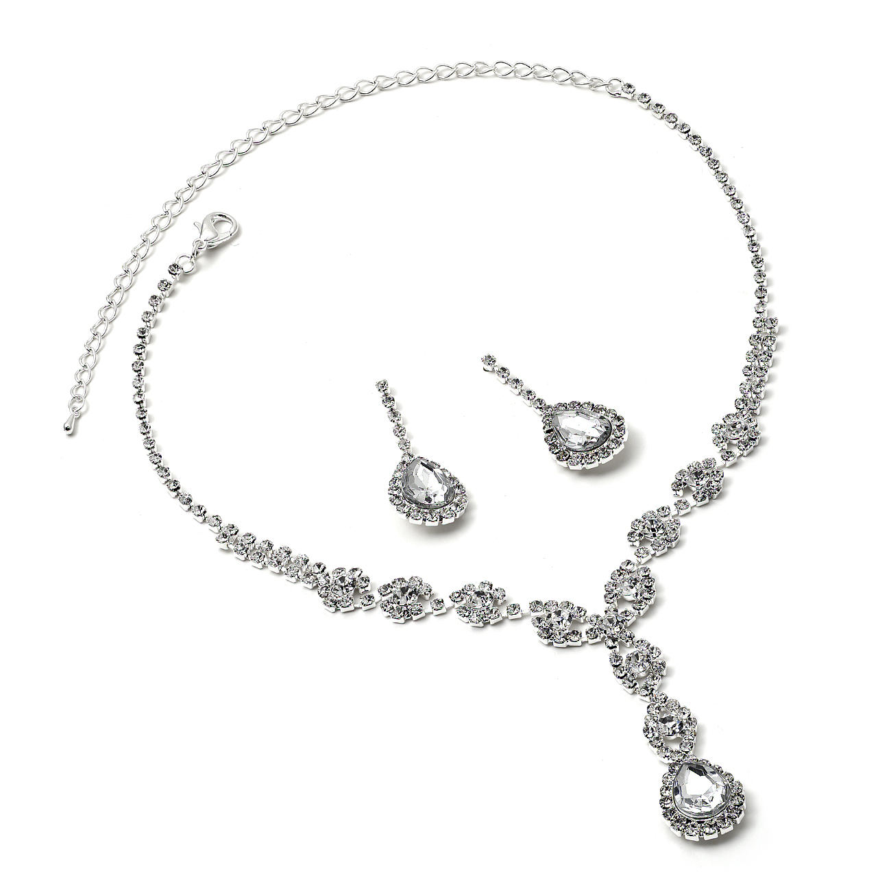 Silver Crystal Rhinestone in Y Neck Formation with Crystal Stones Necklace and Dangle Teardrop Crystal Stone Earrings Jewelry Set