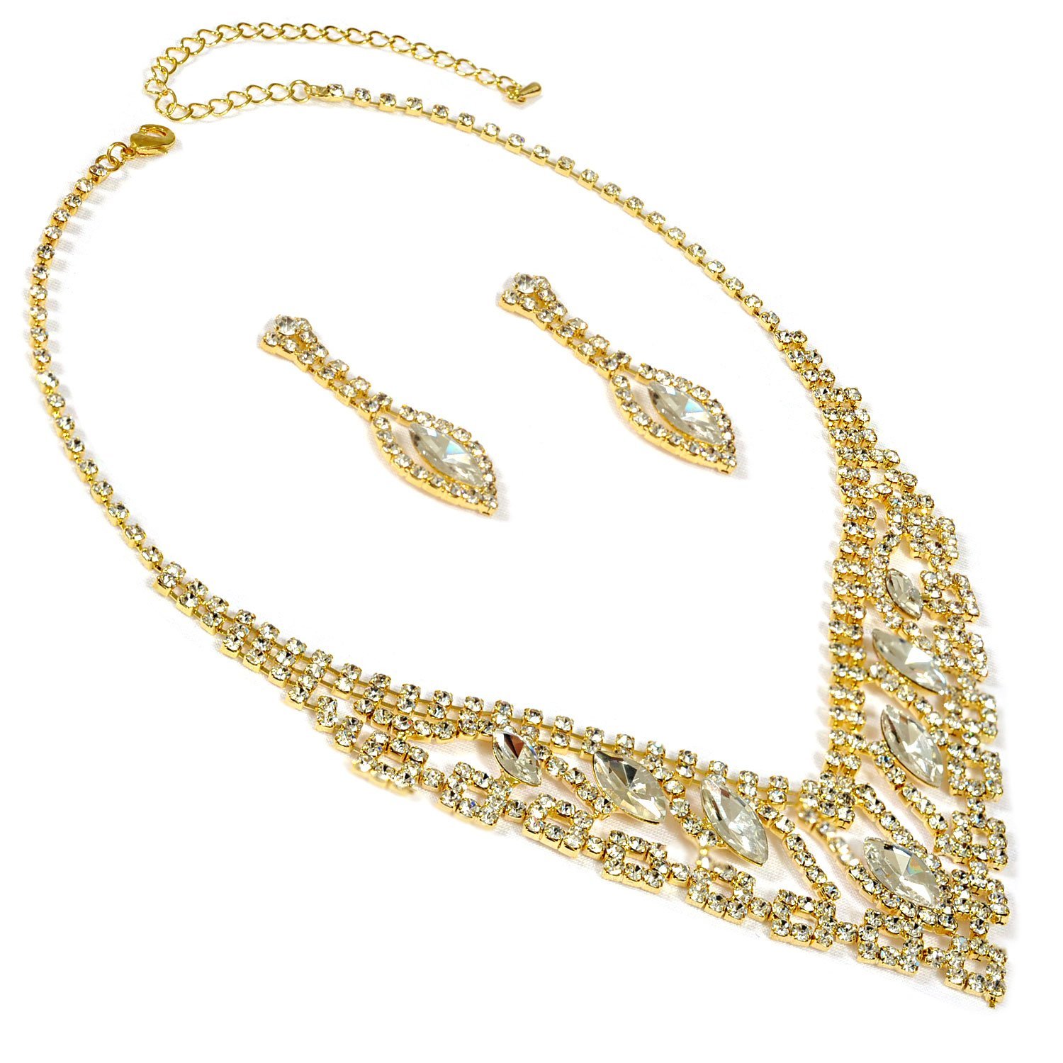 Gold Crystal Rhinestone Necklace Dangle Earrings Jewelry Set