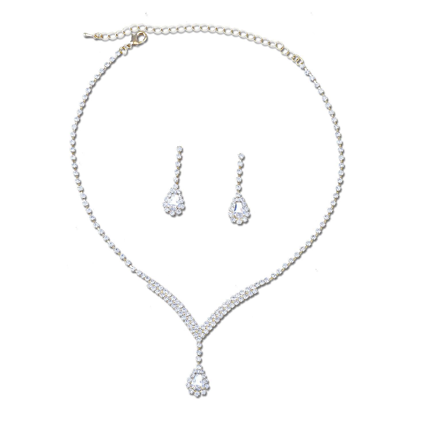 Gold Crystal Rhinestone V Neck with Dangle Crystal Teardrop Necklace and Matching Drop Earrings Jewelry Set