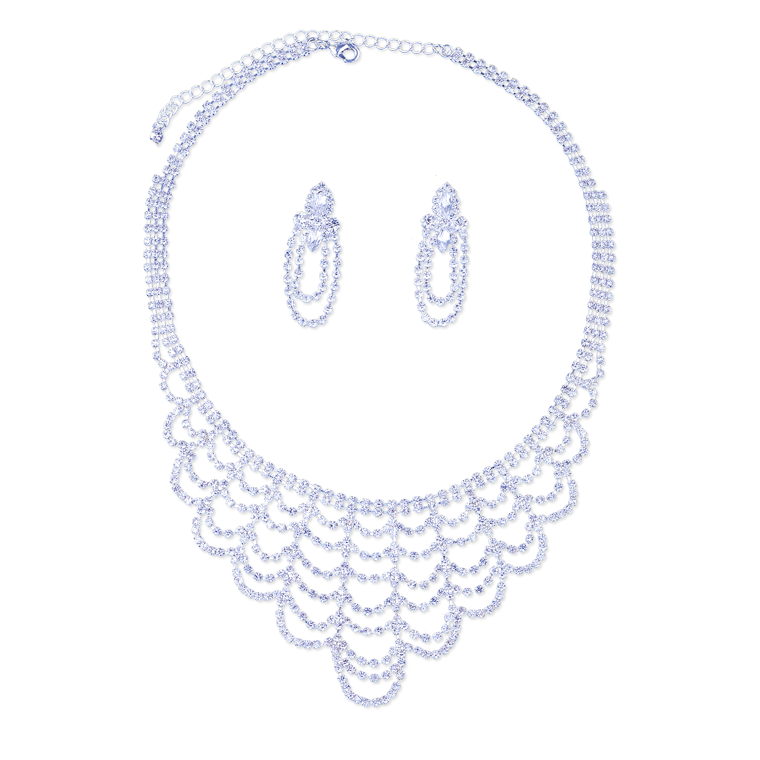Silver Crystal Multi Line Cascading Necklace Earrings